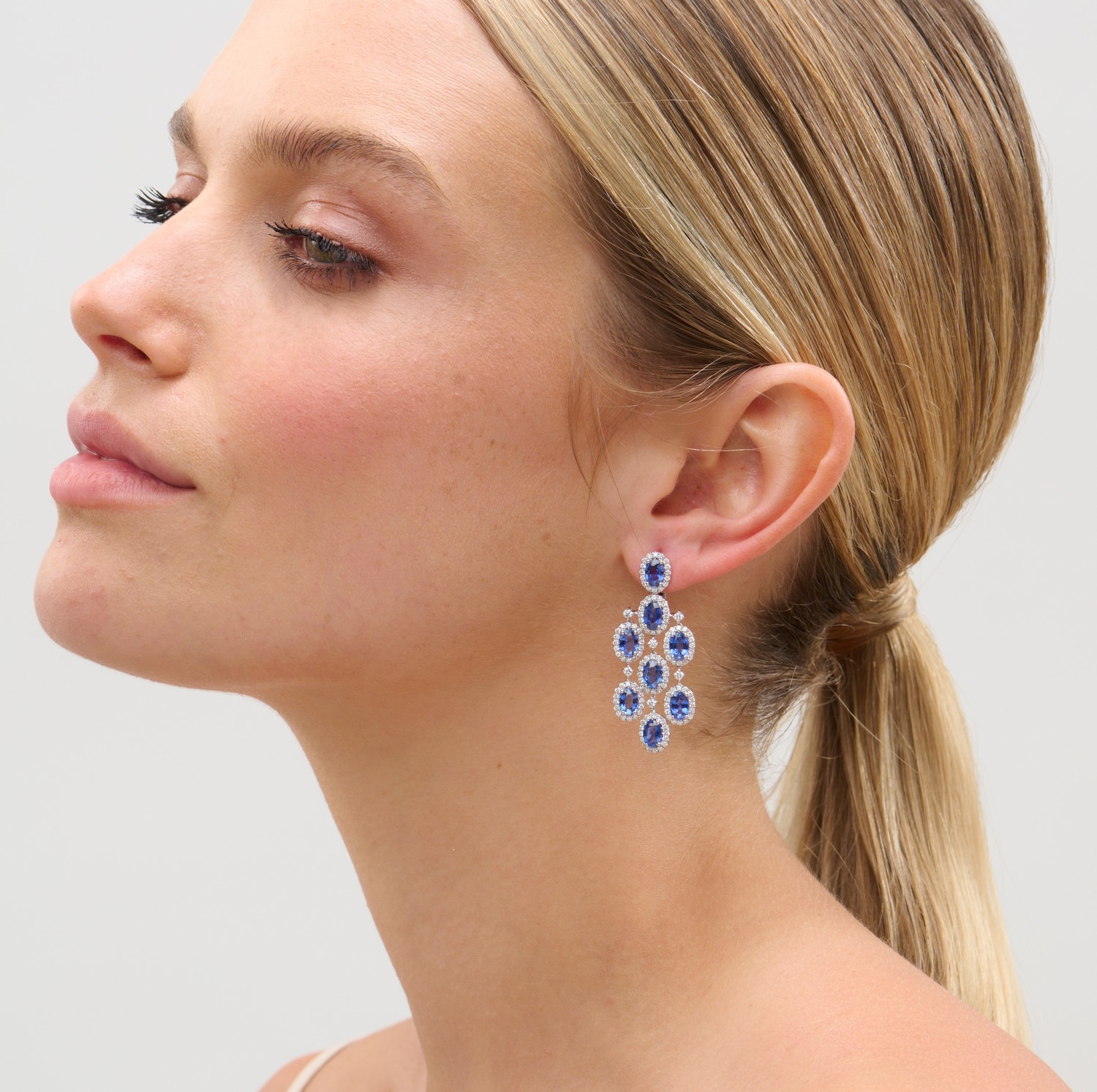 Each surmount of cluster design, centering an oval sapphire framed by a line of brilliant-cut diamonds supporting a cascading fringe of similarly set drops between diamond connectors, mounted in 14ct white gold, the sapphires and diamonds together weighing approximately 9.20 carats and 2.12 carats respectively, length 43mm.