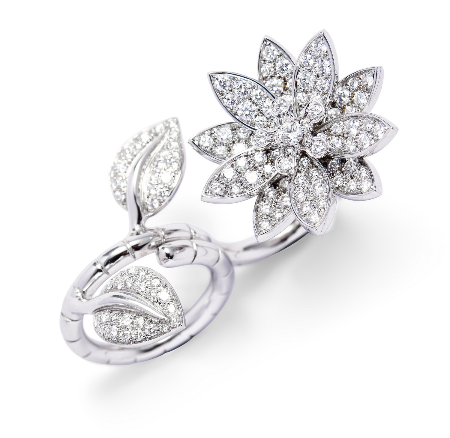 Designed as a lotus flower, the petals and leaves pavé-set with brilliant-cut diamonds, the hinged shank opening to a 'between the finger' ring, the brilliant-cut diamonds together weighing approximately 2.14 carats, mounted in 18ct white gold, size 50 (K), signed V.C.A. for Van Cleef & Arpels, numbered BL24442, French assay for gold and maker's marks.