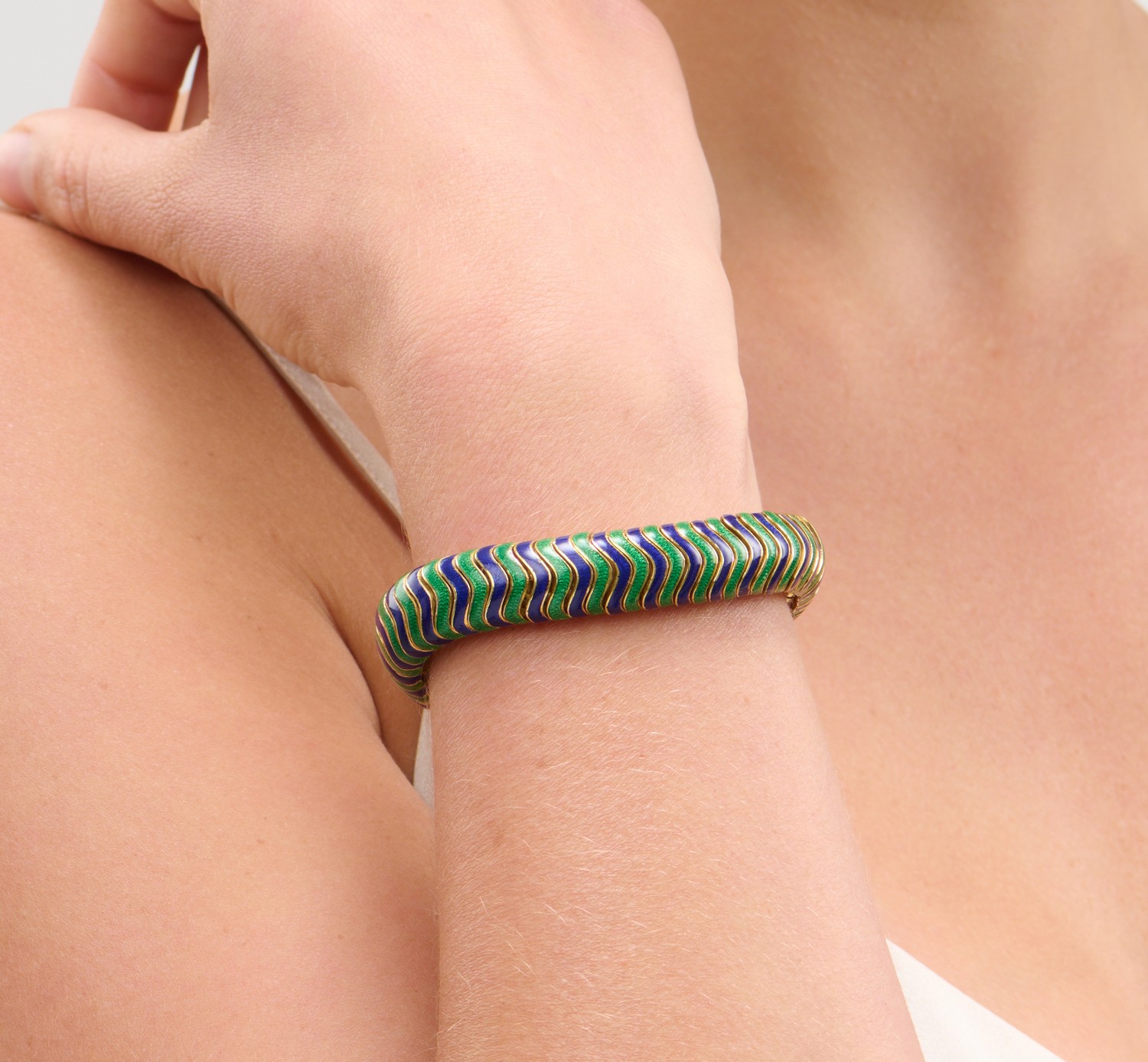 Composed of a line of articulated half-round chevron links applied with blue and green enamel, gross weight 66.10 grams, length 165mm, Italian workshop registration and maker's marks.