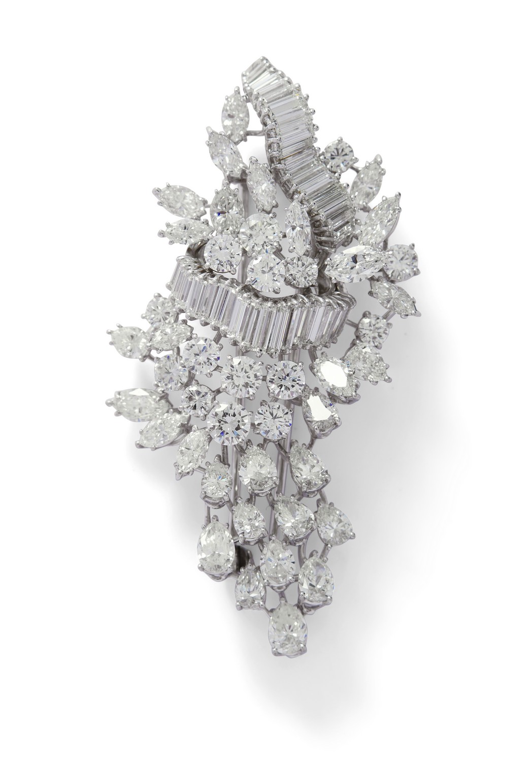 Modelled as a stylised floral bouquet decorated with brilliant-cut, baguette, pear and marquise-shaped diamonds, the 92 diamonds together weighing approximately 13.31 carats, mounted in platinum, length 66mm, width 36mm, trombone clip fitting.