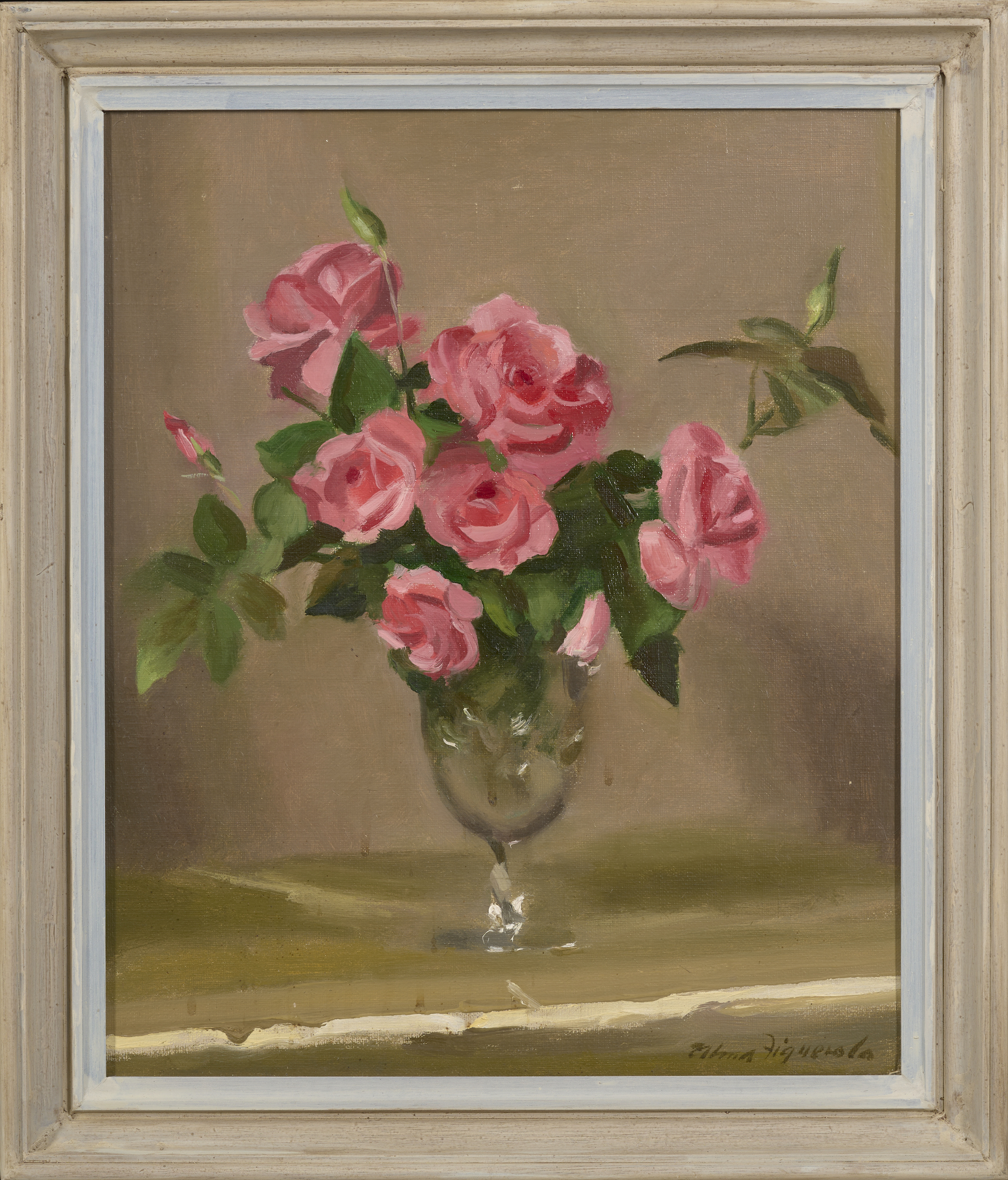 In overall good condition, with some brown surface matter near the vase (drip marks). Overall framed size is 54 x 46cm.