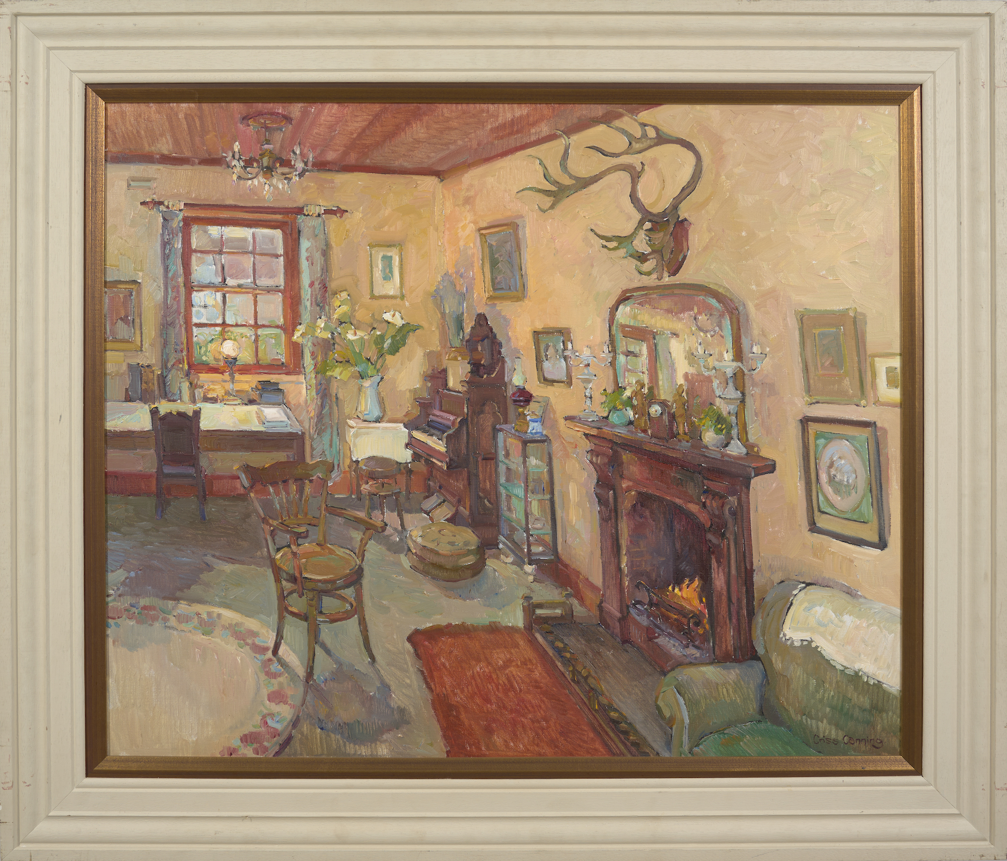 "By 1984 her exhibition at Melbourne Art Exchange her works showed an increased interest in interiors as well as still life flower paintings, the numbers, including landscapes, being spread evenly. The major interiors featured an historic old pub at Birregurra on the way to Apollo Bay. The pub had been converted into a home by a new owner who was delighted to have Criss set up her easel and paint. The several results included "Sitting Room at Birregurra" and "Welcome", with its wealth of Victoriana and a cosy, warm fire." (p. 27, David Thomas)
