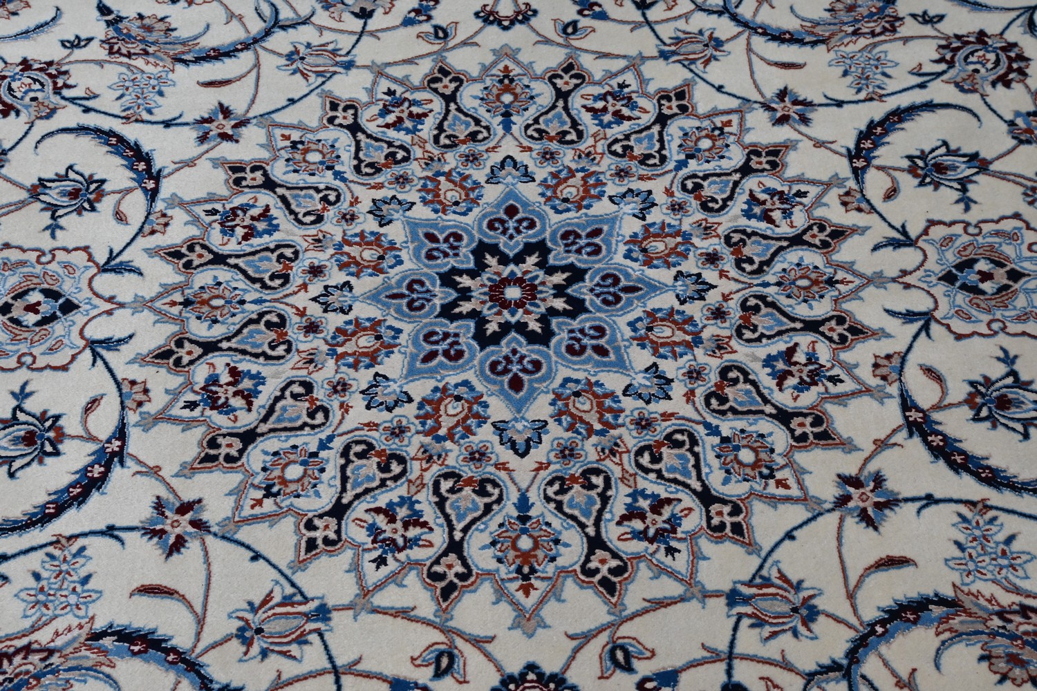 MOST ATTRACTIVE PERSIAN SILK & WOOL NAIEN CARPET EX-GALLERY PIECE. EXTREMELY FINELY HAND-KNOTTED WITH APPROXIMATELY 600,000 INDIVIDUAL KNOTS PER SQUARE METER. COMPRISING OF A 32 POINT INTRICATE LOBED MEDALLION SURROUNDED BY SPRAYS OF ROSES MOTIFS WITH IN AN OUTER LARGE OVAL MEDALLION. ALL MAJOR MOTIFS HIGHLIGHTED WITH PERSIAN CASPIAN SILK WITH A 100% KORK WOOL PILE IN TONES OF INDIGO AND FRENCH BLUE WITH AN IVORY GROUND COLOUR. CARPETS FROM NAIEN ARE RENOWNED FOR THEIR FINE CRAFTSMANSHIP AND POPULARITY ALSO ARE VERY HIGHLY RATED AMONGST THE TOP 5 MAJOR WEAVING REGIONS OF IRAN. SIZE: 356 x 253CM- ORIGIN: IRAN - RRP: $14,000 DOCUMENTATION OF AUTHENTICITY INCLUDED