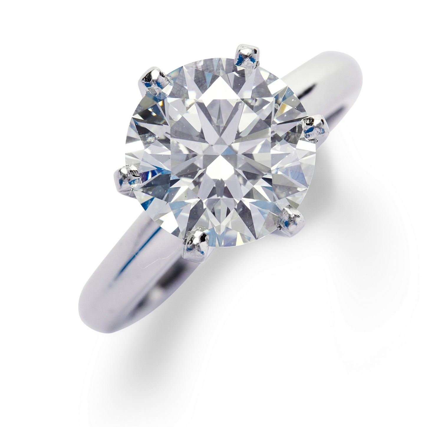 Claw-set with a round brilliant-cut diamond weighing 3.40 carats, mounted in platinum, size J1/2, signed Solstice, Seattle, Washington.