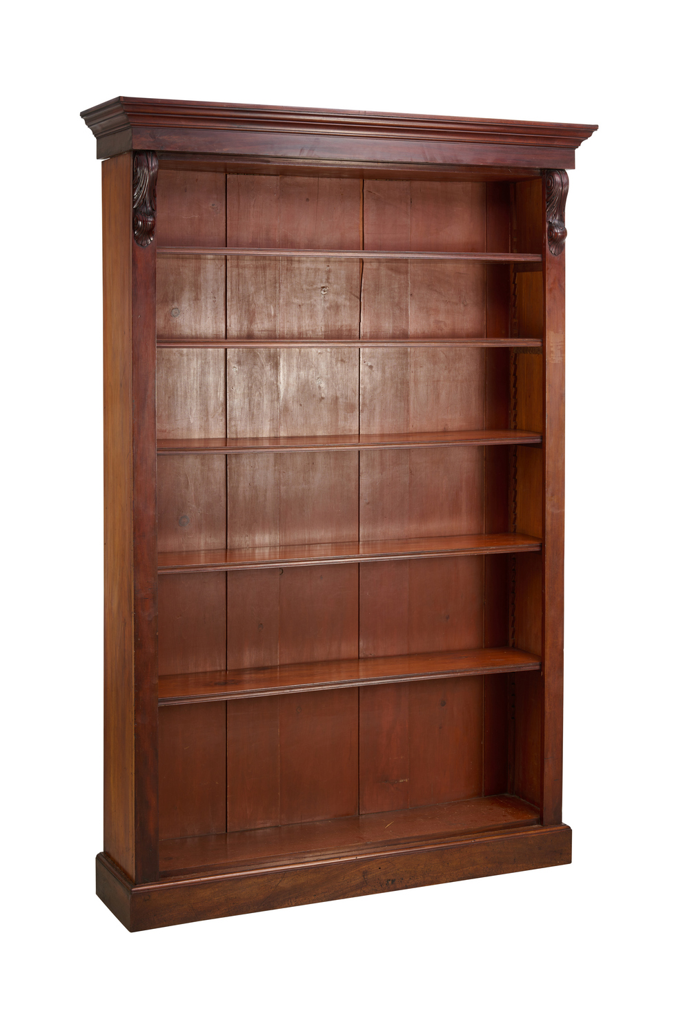 The moulded cornice above a pair of carved corbels and adjustable open shelves, on a plinth base.