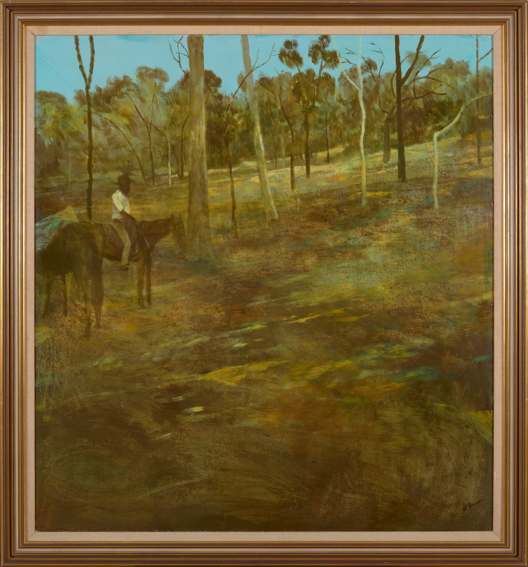 In Boundary Rider, Crooke's personal reticence is visible in the shadowed features of the Aboriginal rider, whose horse almost disappears into the shimmering heat of the landscape. The light on this grassy, forested hill is searing, and its dryness is reflected in the Giotto-influenced translucence of the paint, which evokes the intensity of the northern Australian environment. Writer George Johnston (the subject of Crooke's Archibald Prize-winning portrait in 1970) wrote a foreword to the Palmer River paintings exhibition held at the Johnstone Gallery in 1970 (10 July to 1 August). He suggests, "… [Crooke] has painted this [country] not representationally, nor even mythically, but I think metaphysically… He is concerned with a glimpsed, muted, immobile, strangely haunted landscape, where the flow of time past, and time present, and time eternal is an almost visible, portrayable thing"(3).