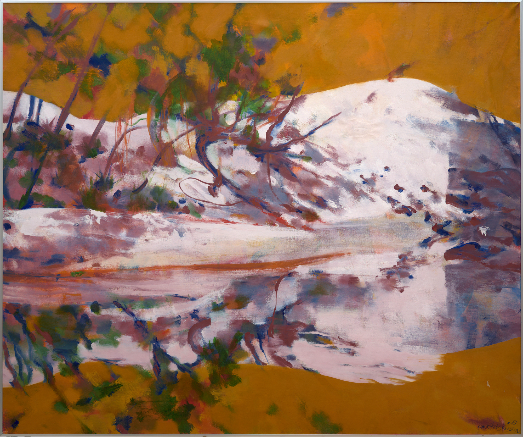 There is evidence of a previous tear repair to the centre right (repair also visible verso). Pigment loss lower right above the signature, largest loss is 3cm in height. Minor abrasion lower left corner. Very minor crazing in paint (stable) upon very close inspection. Overall frame measuring 153 x 183.5cm.