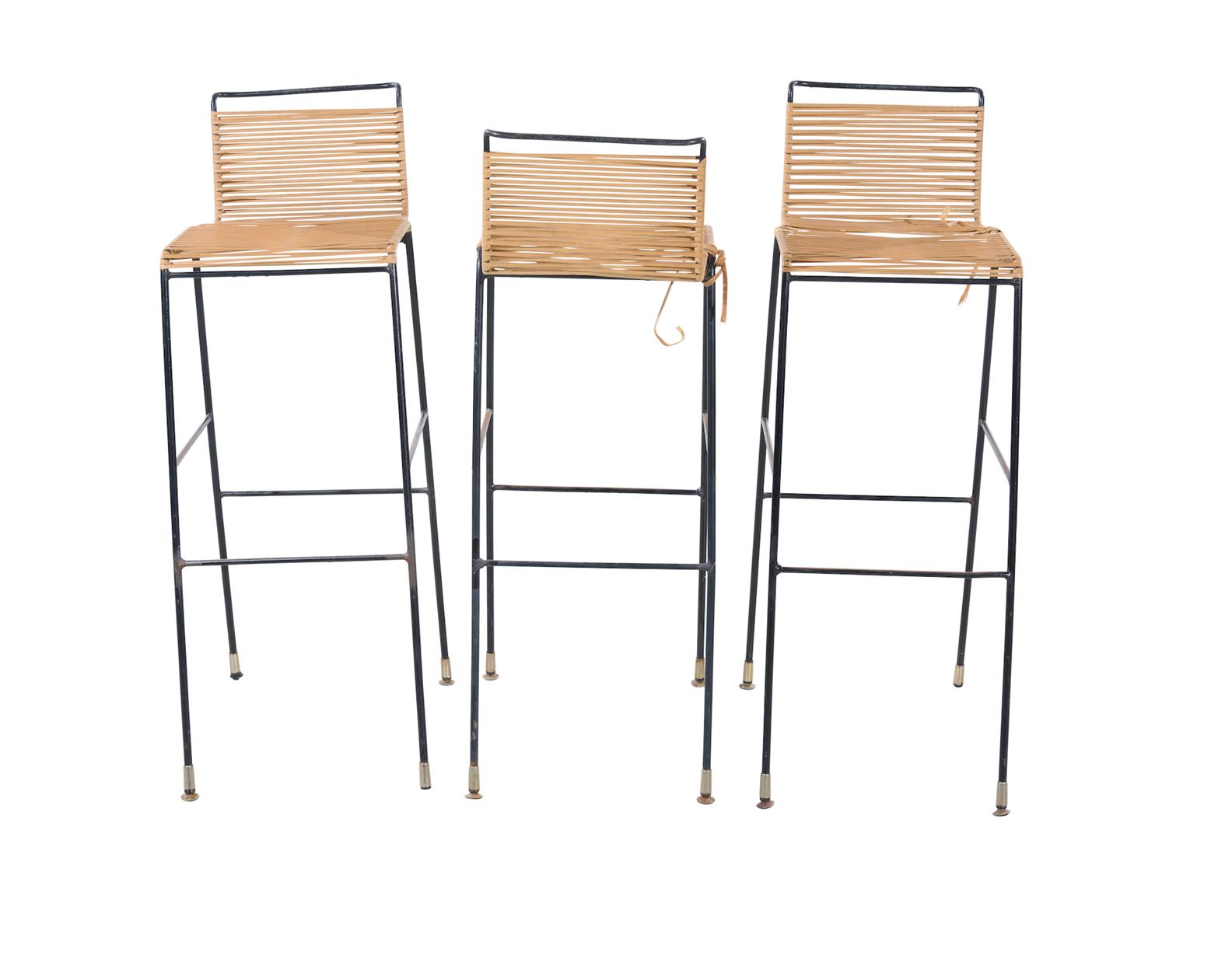 Signs of rusting to the metal frames, in particular to the feet of the chairs. Two of the feet fittings are missing on one of the stools. Obvious discolouration and sun fading to the cording on all three of the stools. The cording has broken on two of the three stools but is still attached. All three stools are intact structurally.