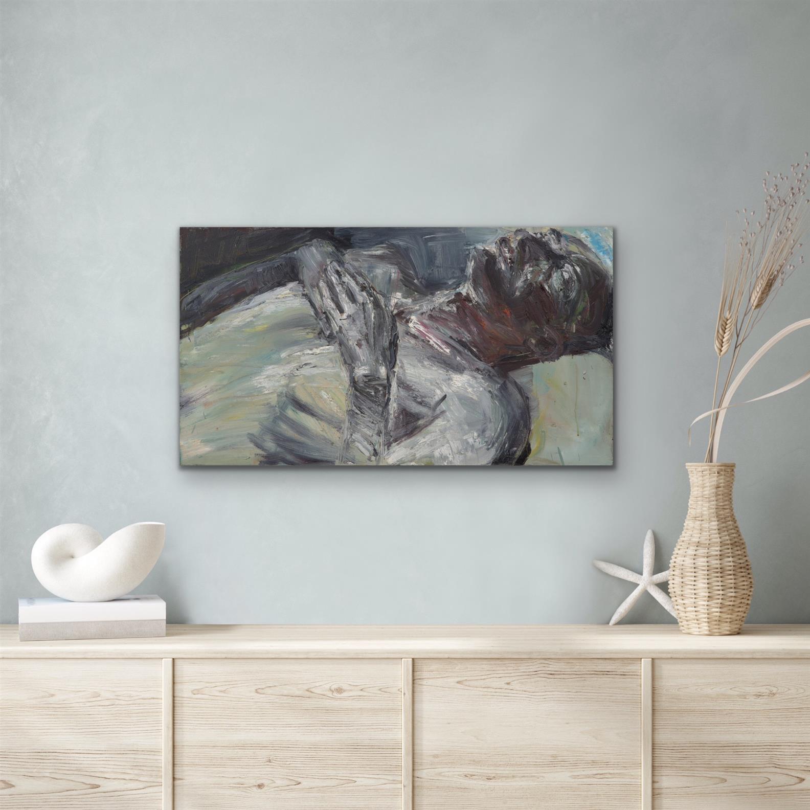 Work in good condition overall. Surface mark present in lower right hand corner presenting as a drop. Dirt and handling marks also present lower right corner. Stretched canvas, unframed.