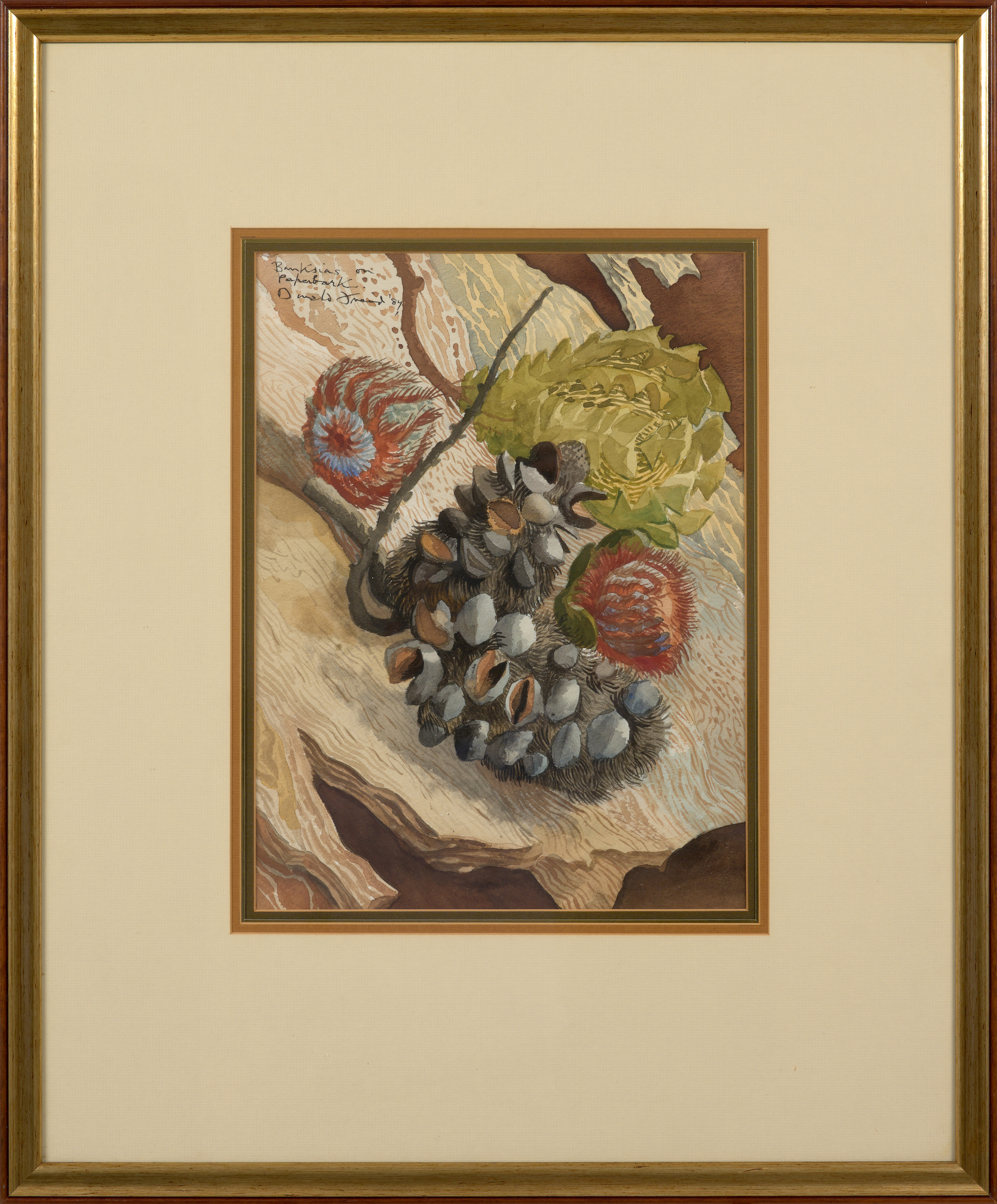 signed, titled and dated upper left: Banksias on / Paperbark / Donald Friend '84