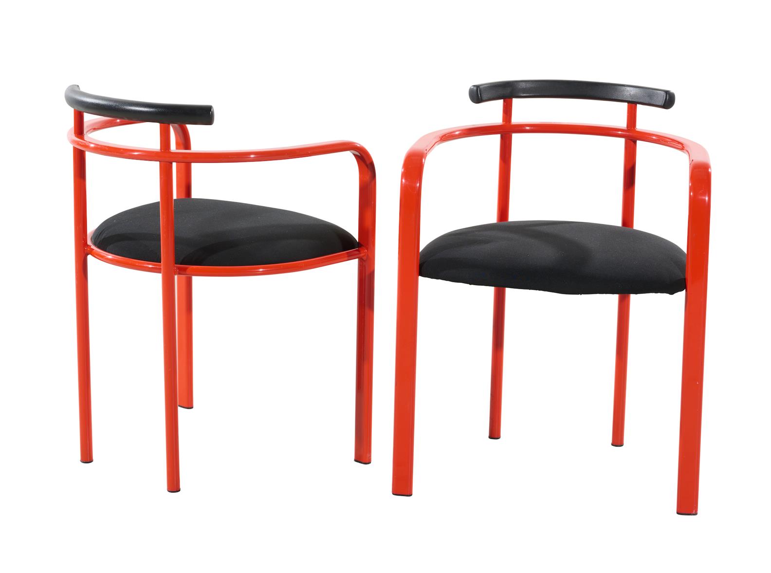 Orange powder coated metal with rubber back feature and original black cotton upholstered seats.