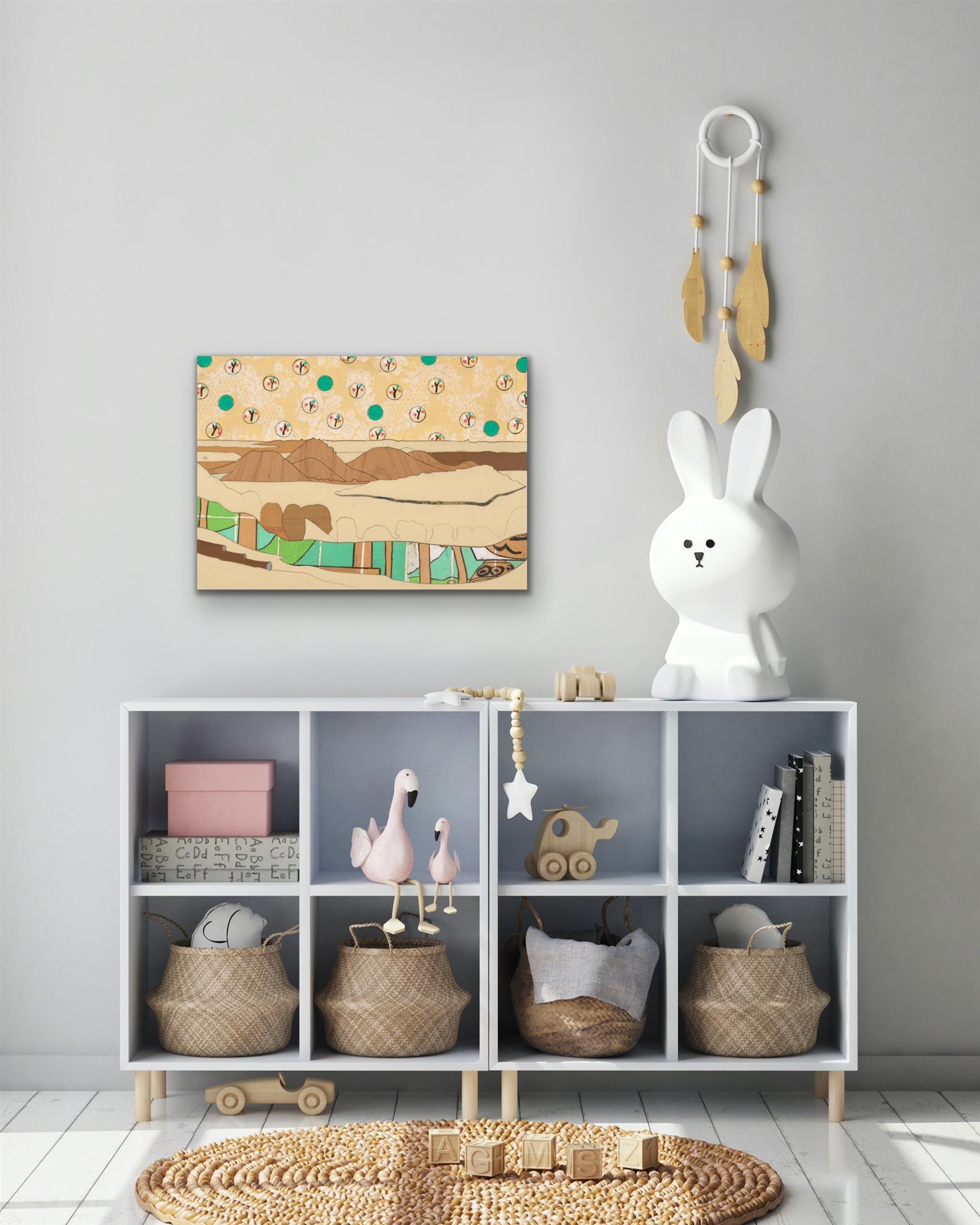Work is in fair condition. Surface blemishes and dirt present on the surface in areas where collage has been adhered to the work, some corners appear to be lifting and not fully adhered to the board. No additional framing.