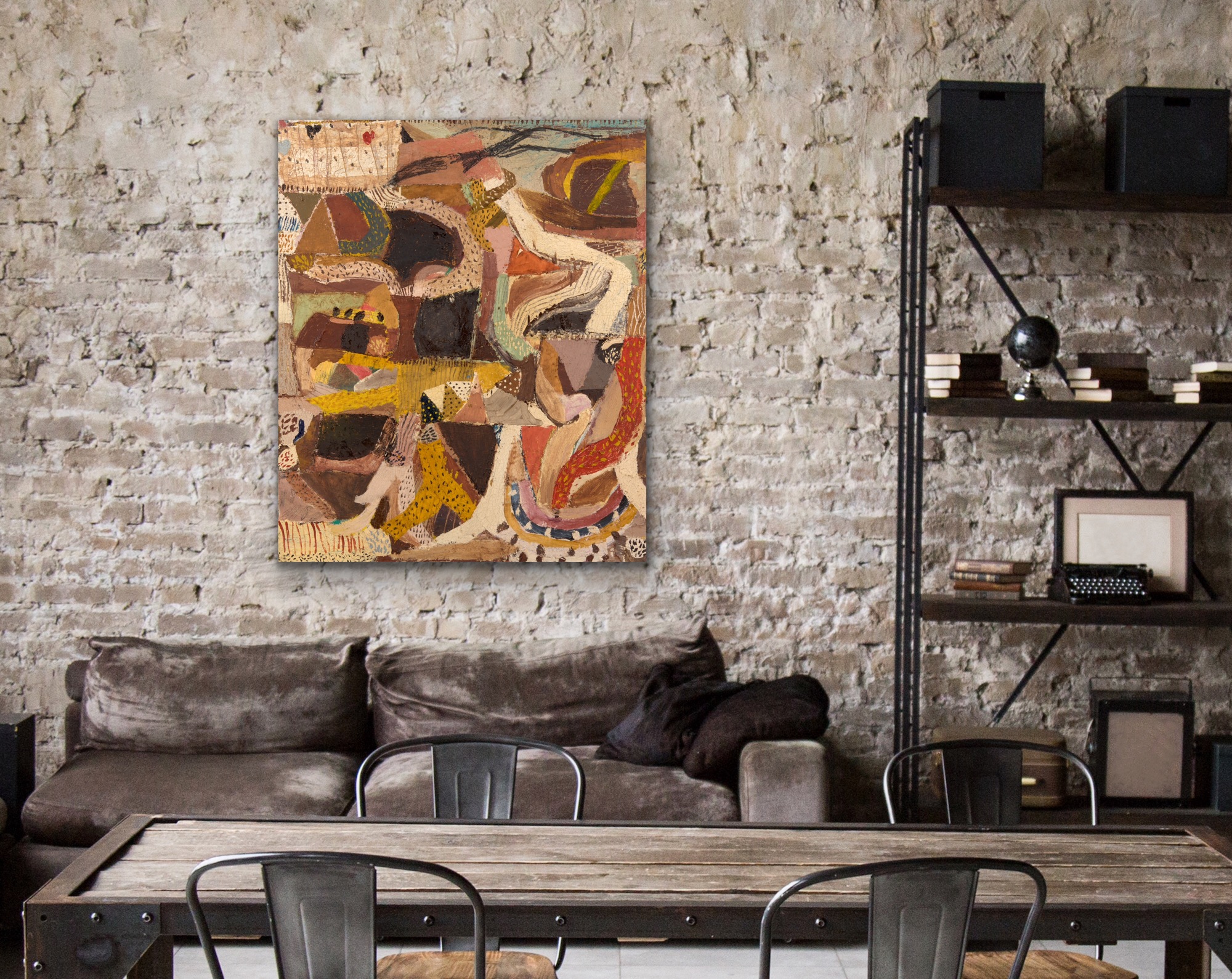 Dust and dirt built up in layered areas of paint. The impasto has split across the entire painting surface, likely due to the thickness of paint layer or absence of proper priming.