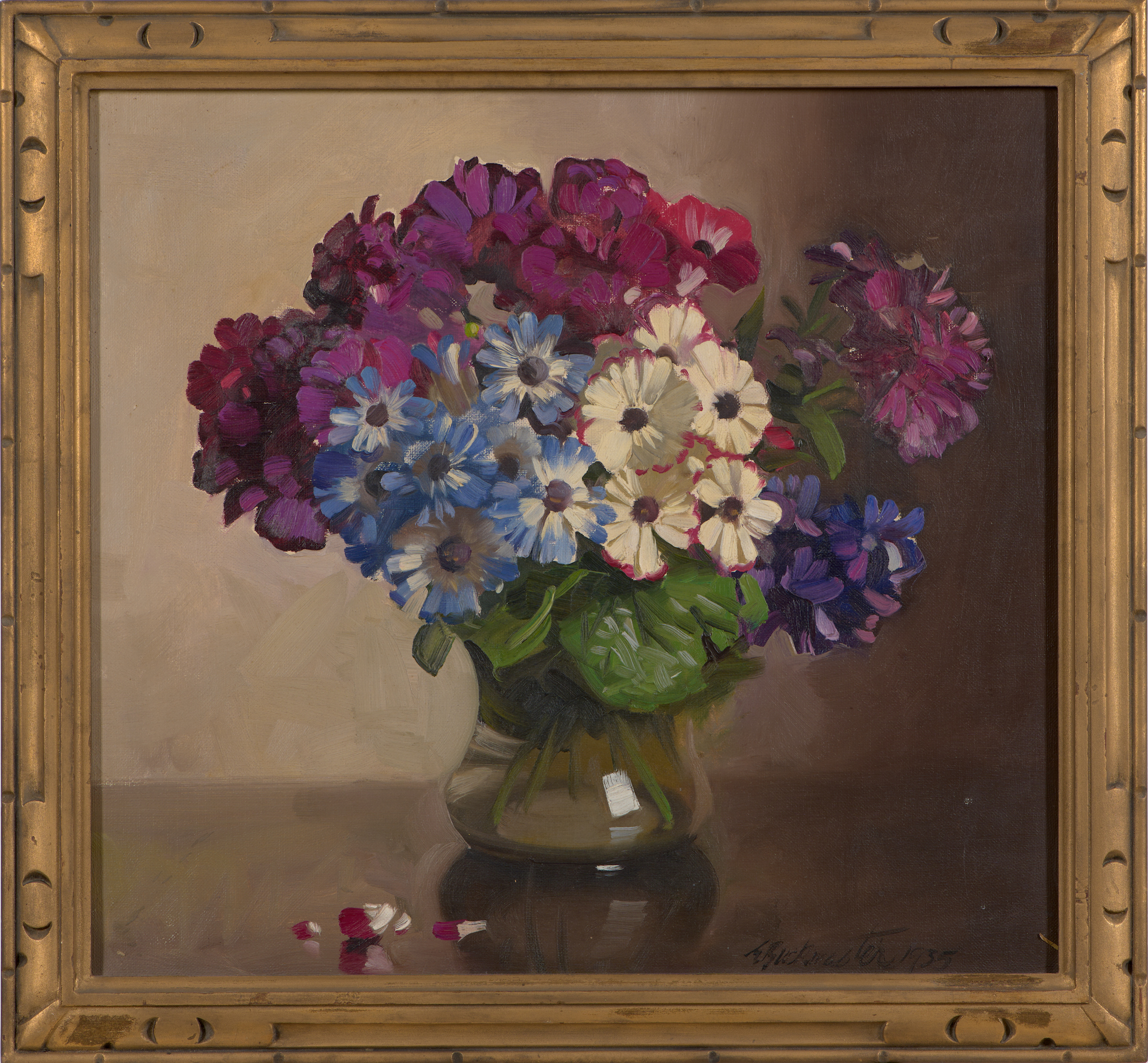 Work in good condition overall. Small area of paint loss present in the lower right hand corner. Some fly spotting on the surface present in the upper left hand corner. Housed in its original John Thallon frame (label verso), measuring 62 x 66cm.