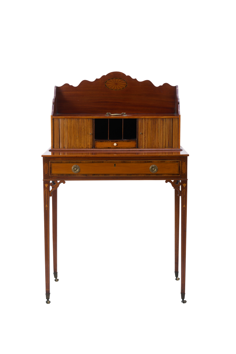 The rectangular top surmounted with a removable gallery fitted with an arrangement of drawers and compartments, the frieze drawer fitted with a writing surface raised on a ratchet support, raised on tapering square supports with brass caps and casters, banded and inlaid throughout in satinwood and rosewood