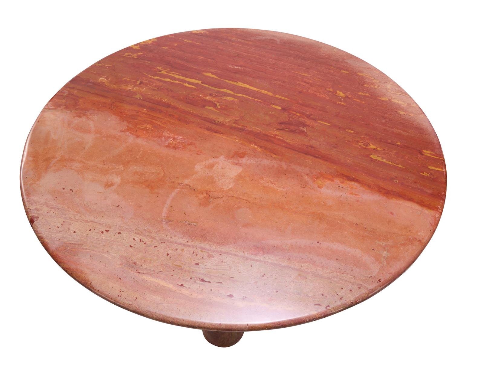 Rare red travertine. The table consists of three pillar legs and the round table top.