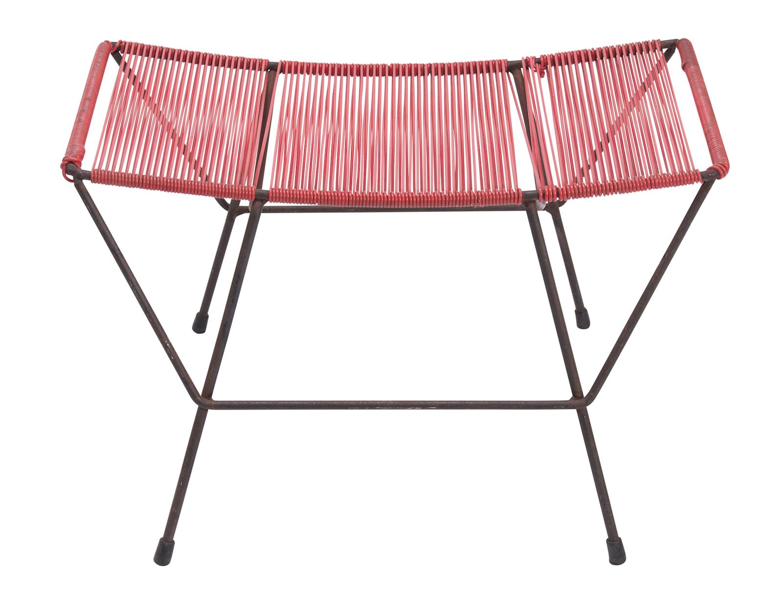 Red plastic cording, black painted metal frame, with rubber feet.