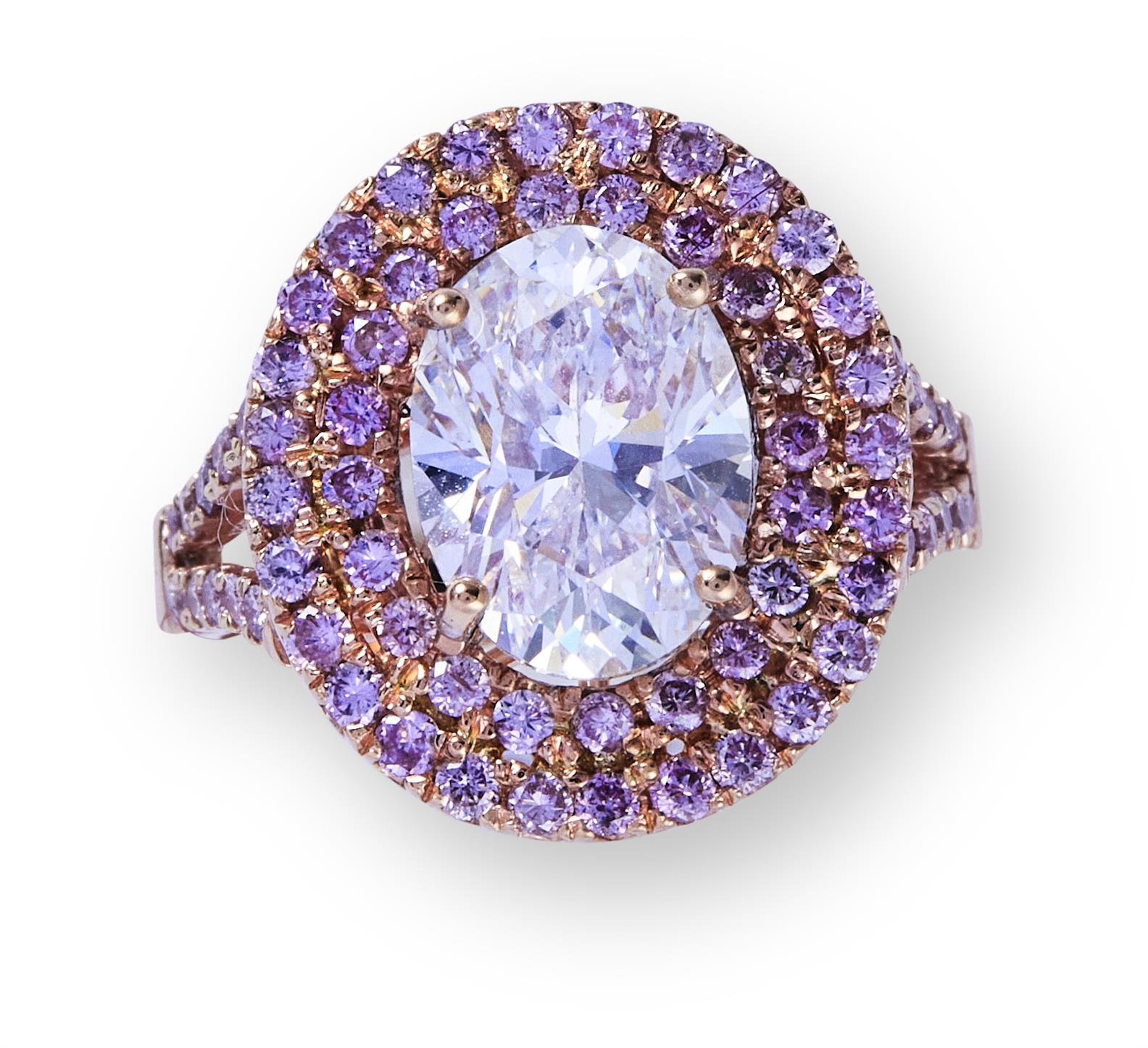 Of cluster design, centring a claw-set oval brilliant-cut diamond weighing 2.01 carats, framed by a double halo of pavé-set fancy pink brilliant-cut diamonds to similarly set split shoulders, the fancy pink diamonds together weighing approximately 0.61 carats, mounted in 18ct pink gold, size F1/2.