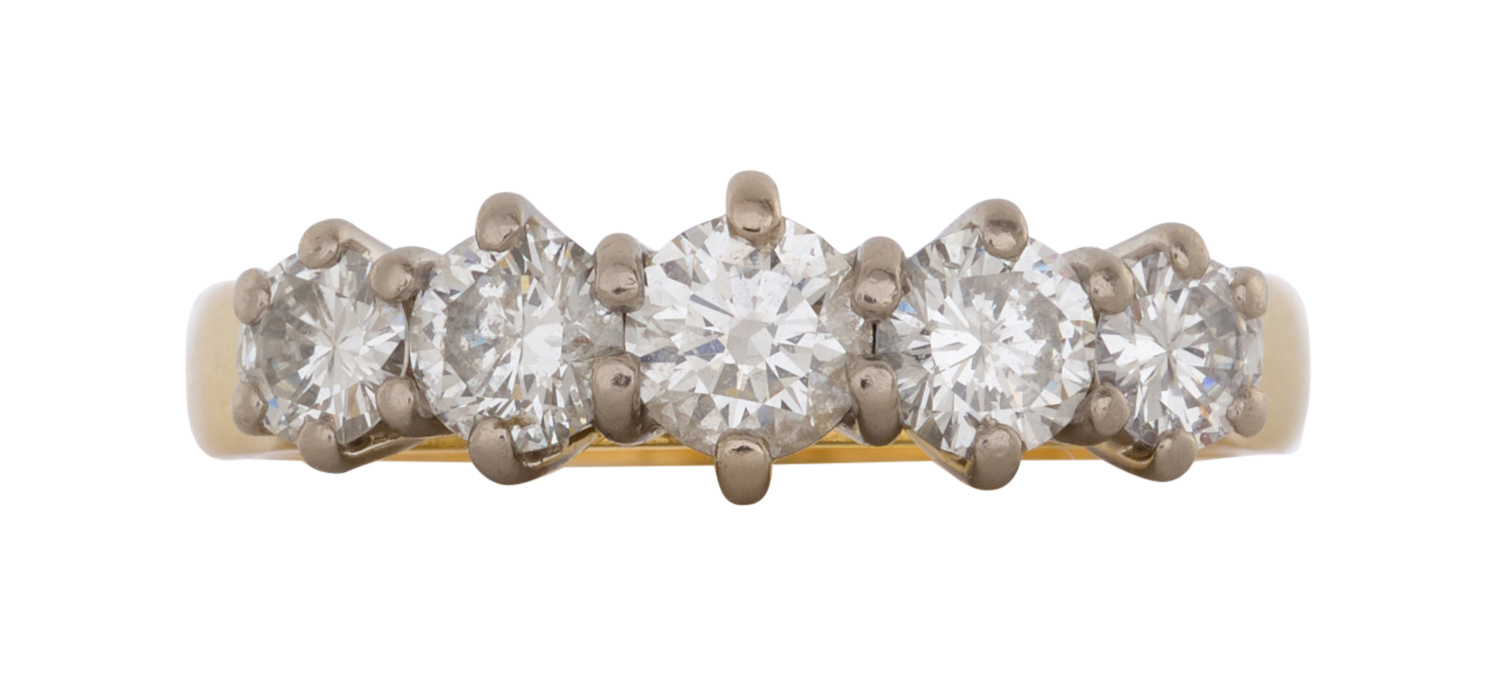 A FIVE STONE DIAMOND RING IN 18CT GOLD AND WHITE GOLD, RING SIZE K/L, THE DIAMONDS TOTALLING APPROXIMATLEY 1.0CT (MEASURED IN SETTING), 5.24GMS