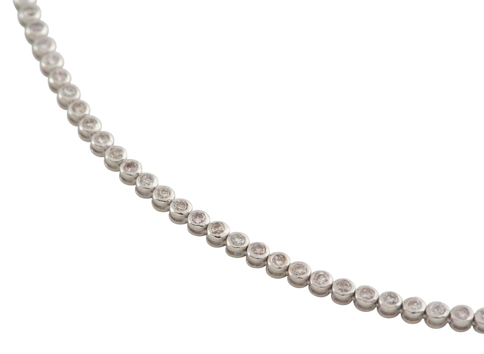 A DIAMOND RIVIÈRE IN 18CT WHITE GOLD, COMPRISING ONE HUNDRED AND FORTY-FOUR BEZEL-SET FAINT PINK BRILLIANT-CUT DIAMONDS TOGETHER WEIGHING 5.78 CARATS, COMPLETED BY A BOX CLASP, LENGTH APPROXIMATELY 450MM, WITH VALUATION