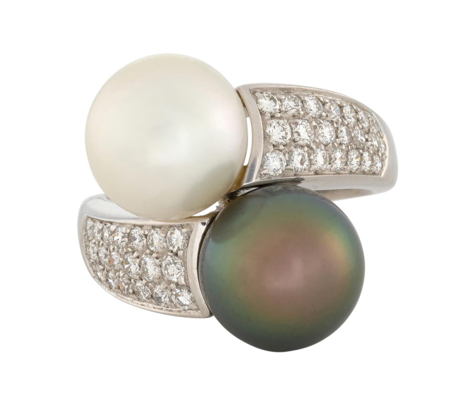 A PEARL AND DIAMOND 'ANAIS' RING IN 18CT WHITE GOLD BY BOUCHERON, OF TOI ET MOI DESIGN, COMPRISING A ROUND SOUTH SEA PEARL OF WHITE HUES MEASURING APPROXIMATELY 11.70MM AND A ROUND TAHITIAN PEARL OF DARK GREY HUES MEASURING APPROXIMATELY 11.66MM, TO TAPERED PAVÉ-SET DIAMOND SHOULDES, SIGNED BOUCHERON, SIZE Q (53)