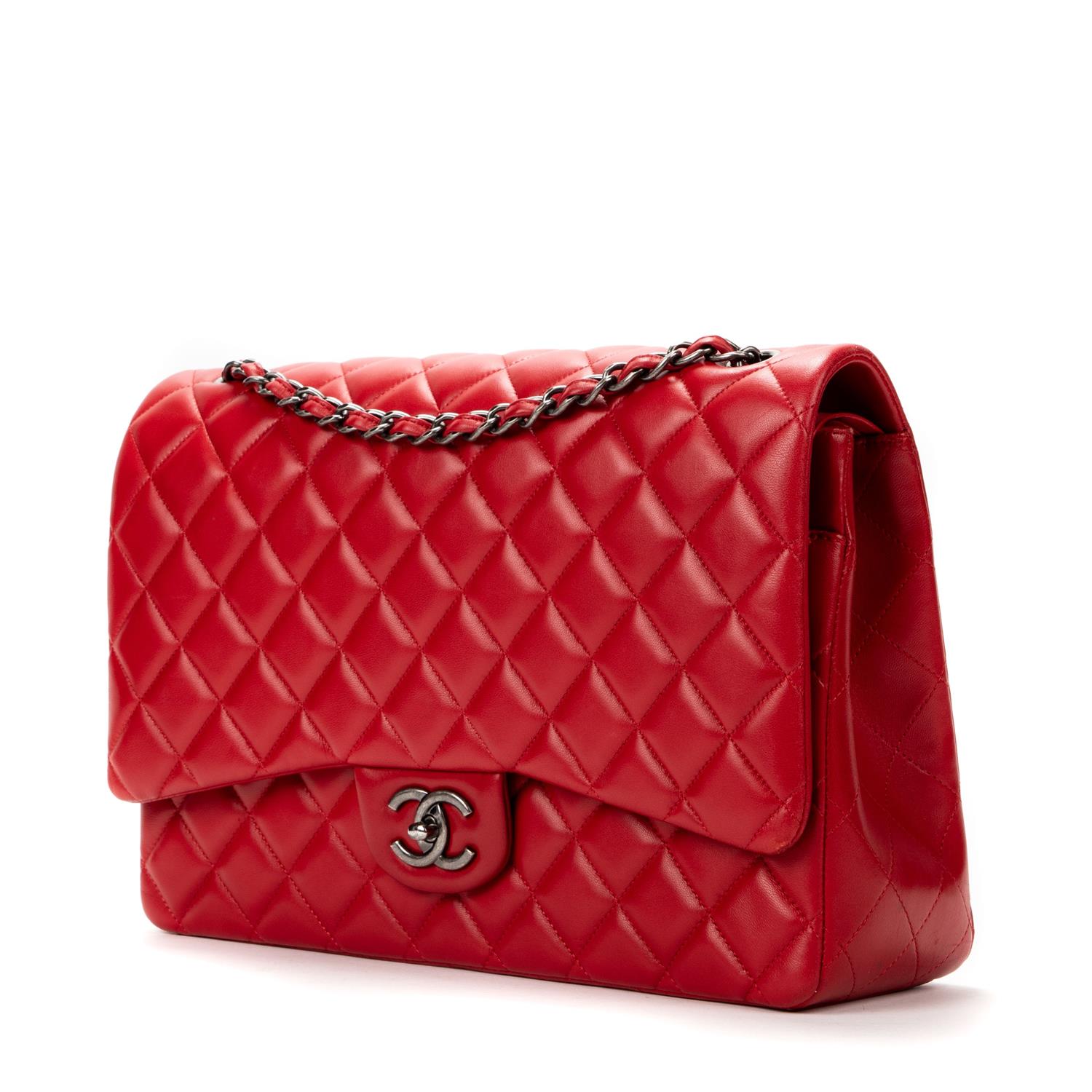 Styled in red quilted calfskin leather with interlaced chain shoulder strap and dark silver tone hardware, 33 x 23 x 9cm.