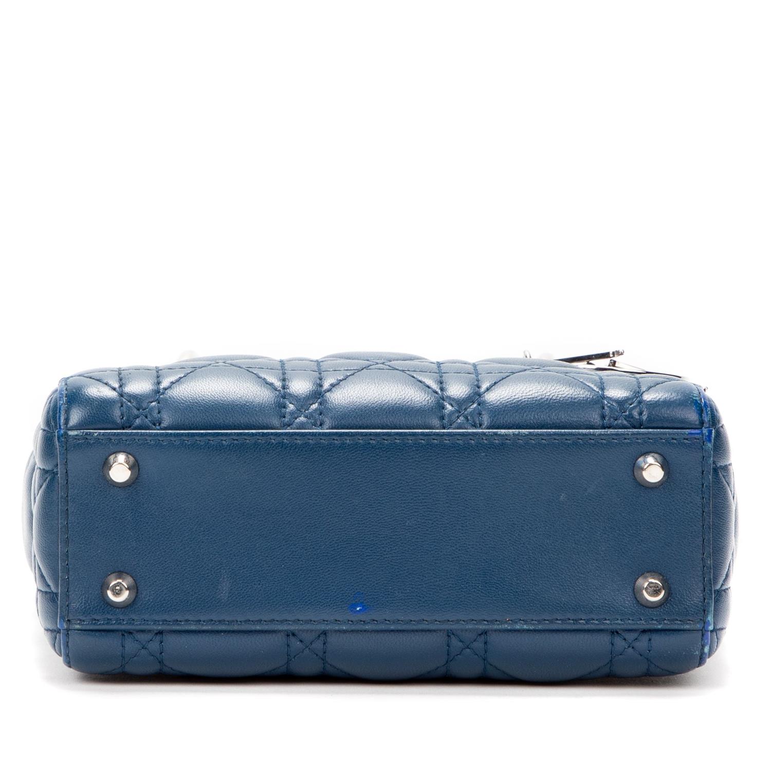Styled in blue calfskin leather with detachable shoulder strap and silver tone metal hardware, 17 x 14 x 7cm.