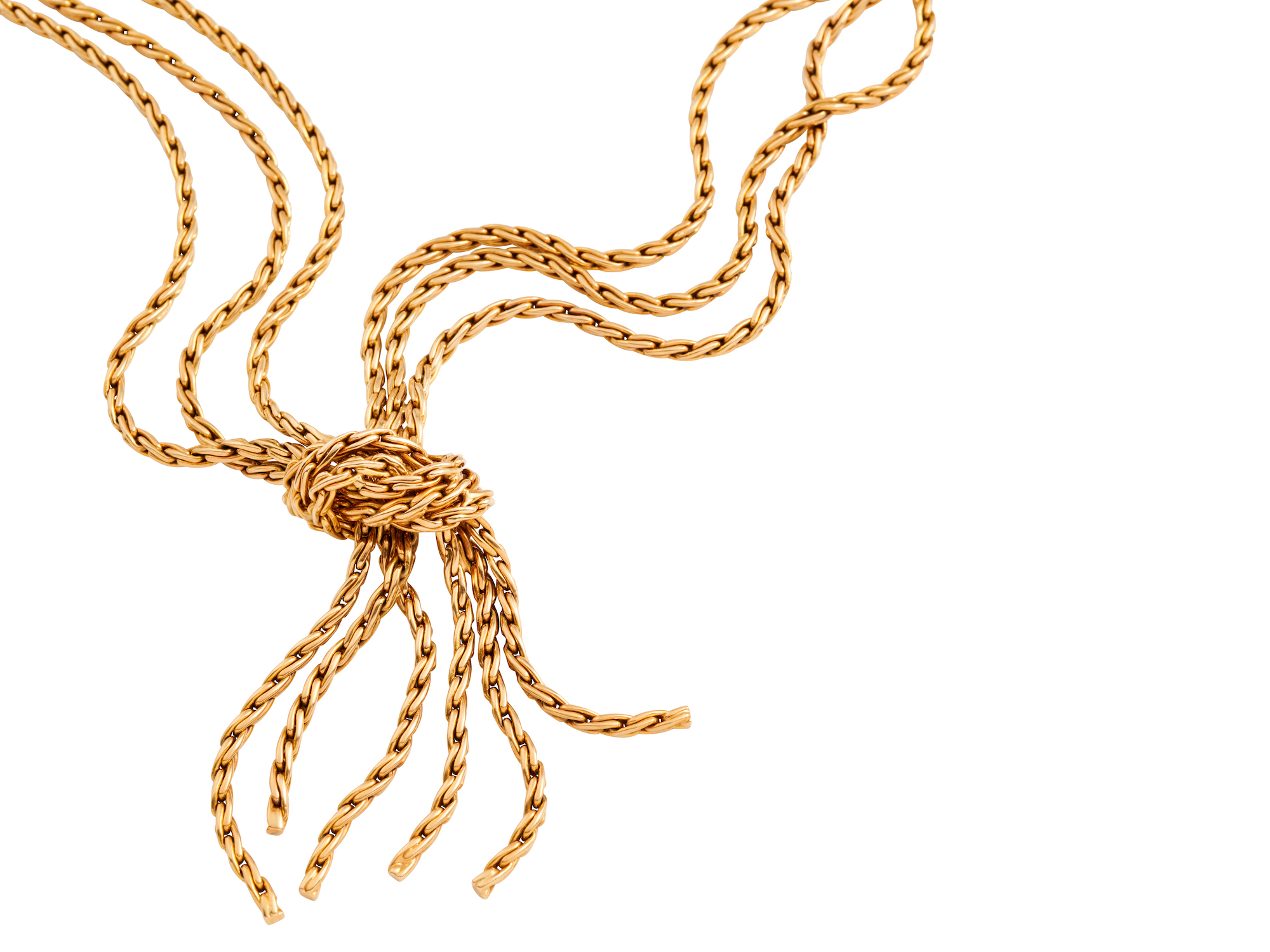 Comprising a triple wheat link chain with knot tassle, signed V.C.A and numbered 4V175, length approximately 760mm.