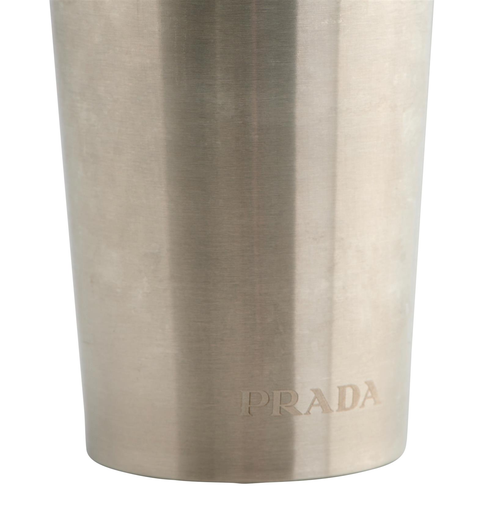 PRADA, TRAVEL MUG - Styled in stainless steel with frosted logo detail, height 17cm, no holder.