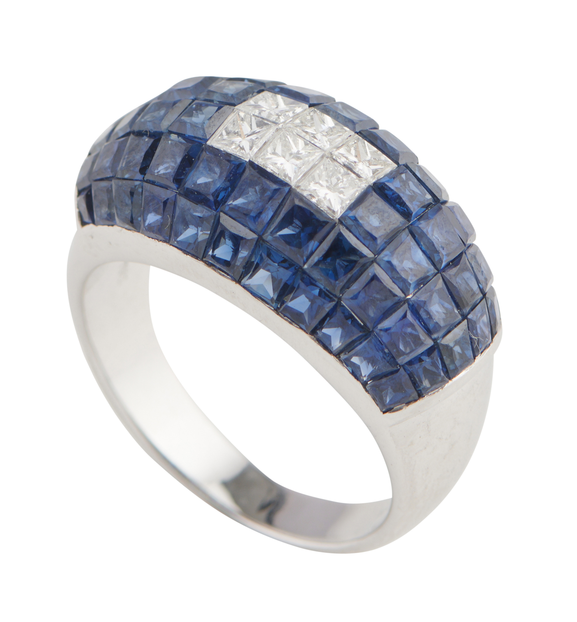 The rounded panel, centring six invisible-set princess-cut diamonds together weighing approximately 0.70 carats, within a surround of sixty invisible-set square baguette-cut sapphires together weighing approximately 3.50 carats, size M.