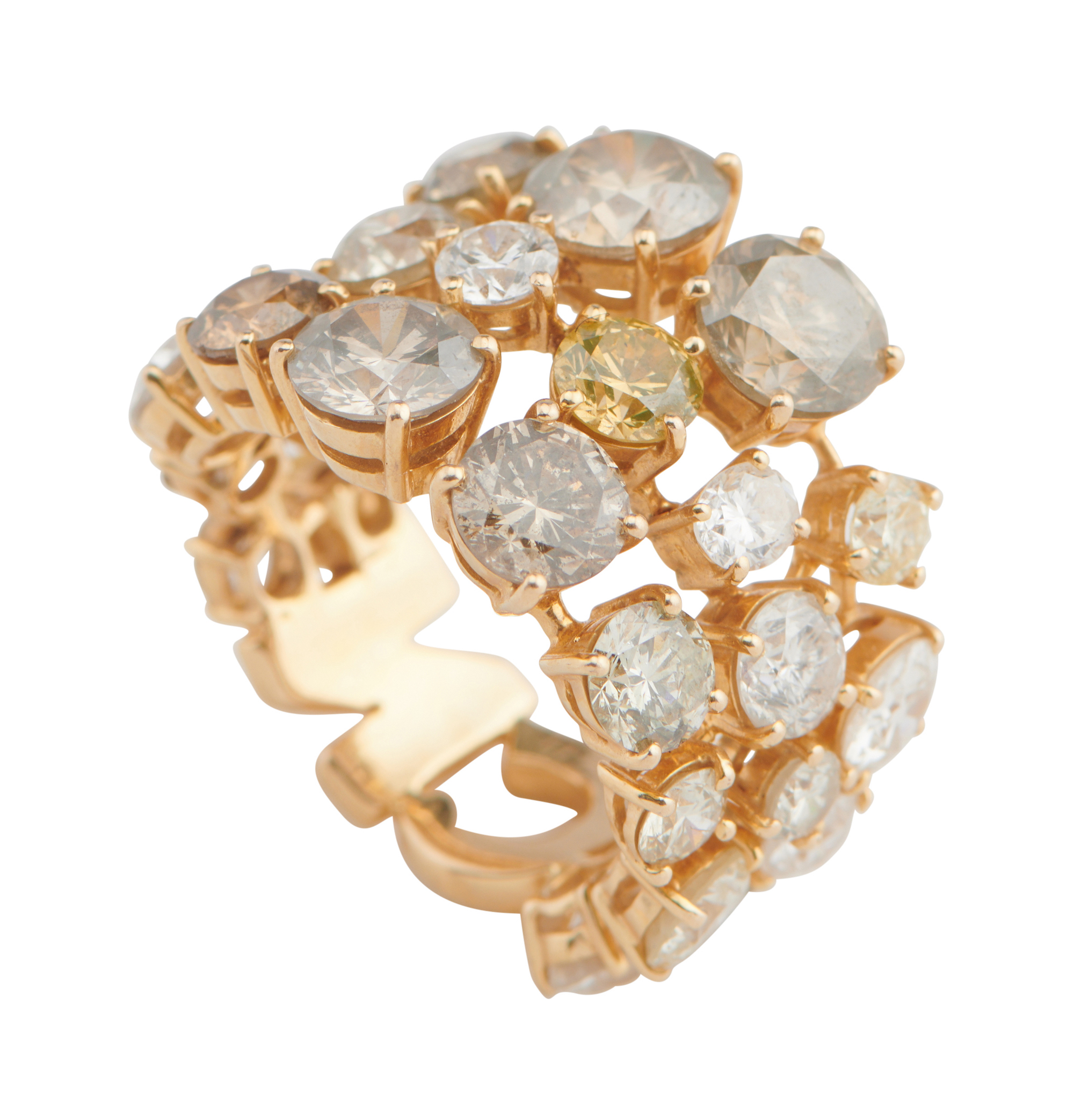 Comprising three rows of claw-set brilliant-cut diamonds in varying white, yellow, champagne and cognac hues together weighing approximately 7.00 carats, the underside shank styled in lettering 'CN', size L.