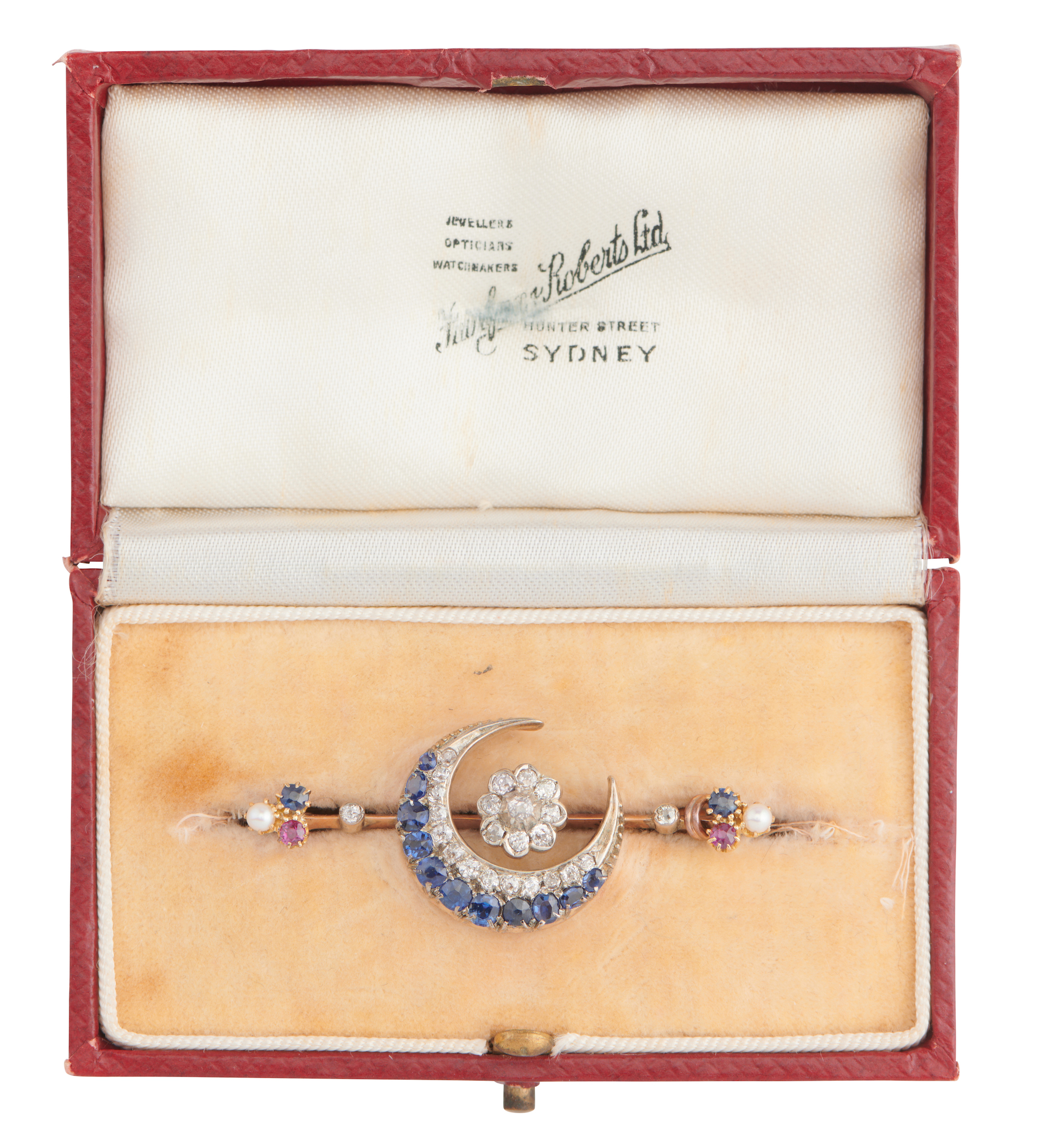 Of bar design, centring a floral cluster and crescent set with old European-cut diamonds together weighing approximately 0.40 carats and circular-cut sapphires together weighing approximately 1.50 carats, the ends terminating in a trefoil of sapphire, ruby and pearl, length approximately 47mm, accompanied by a period Fairfax and Roberts box.