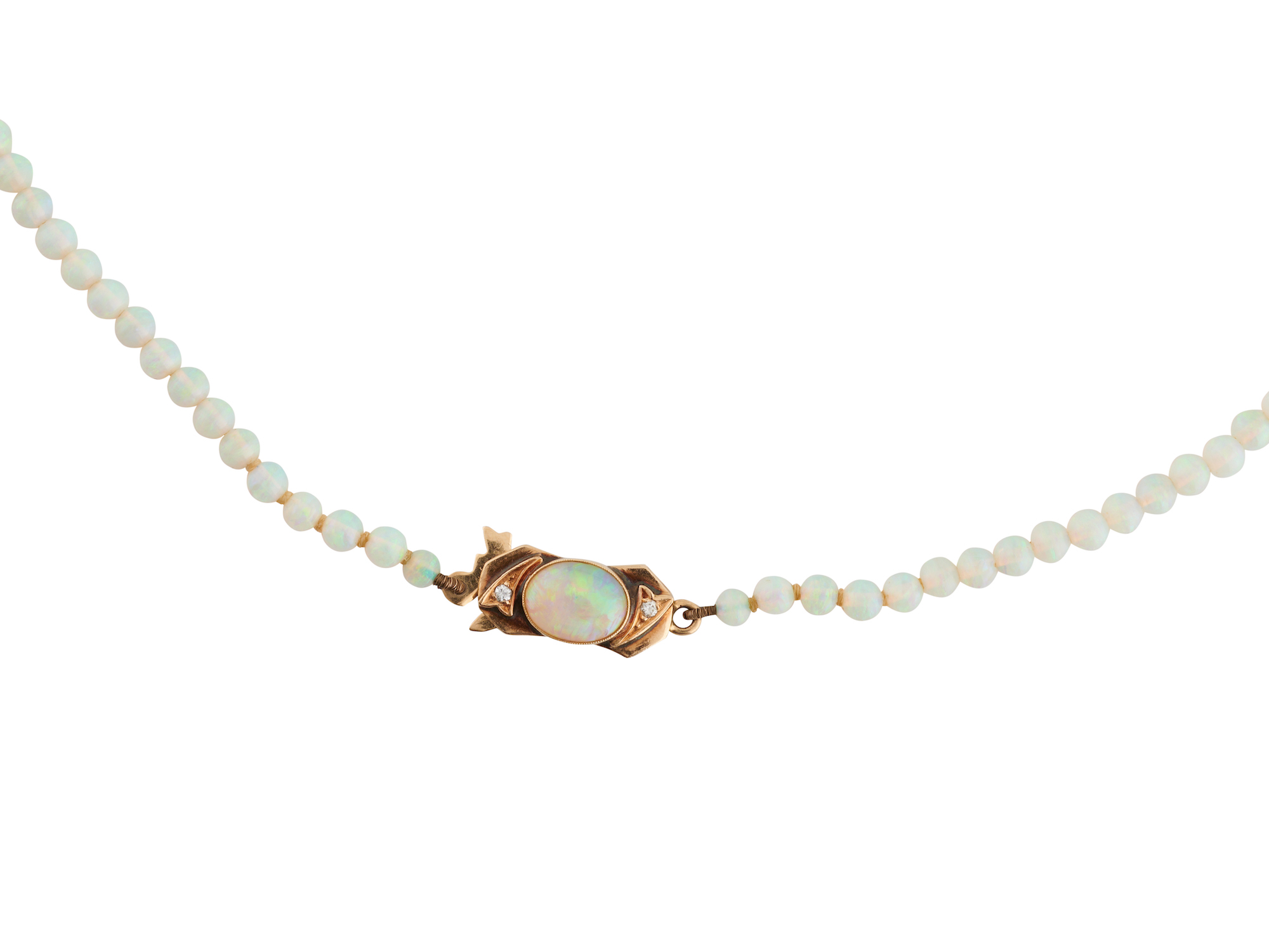 Comprising one hundred eleven graduated round opal beads measuring approximately 2.89mm - 5.61mm, completed by an opal and diamond set clasp in 14ct gold, length approximately 430mm.