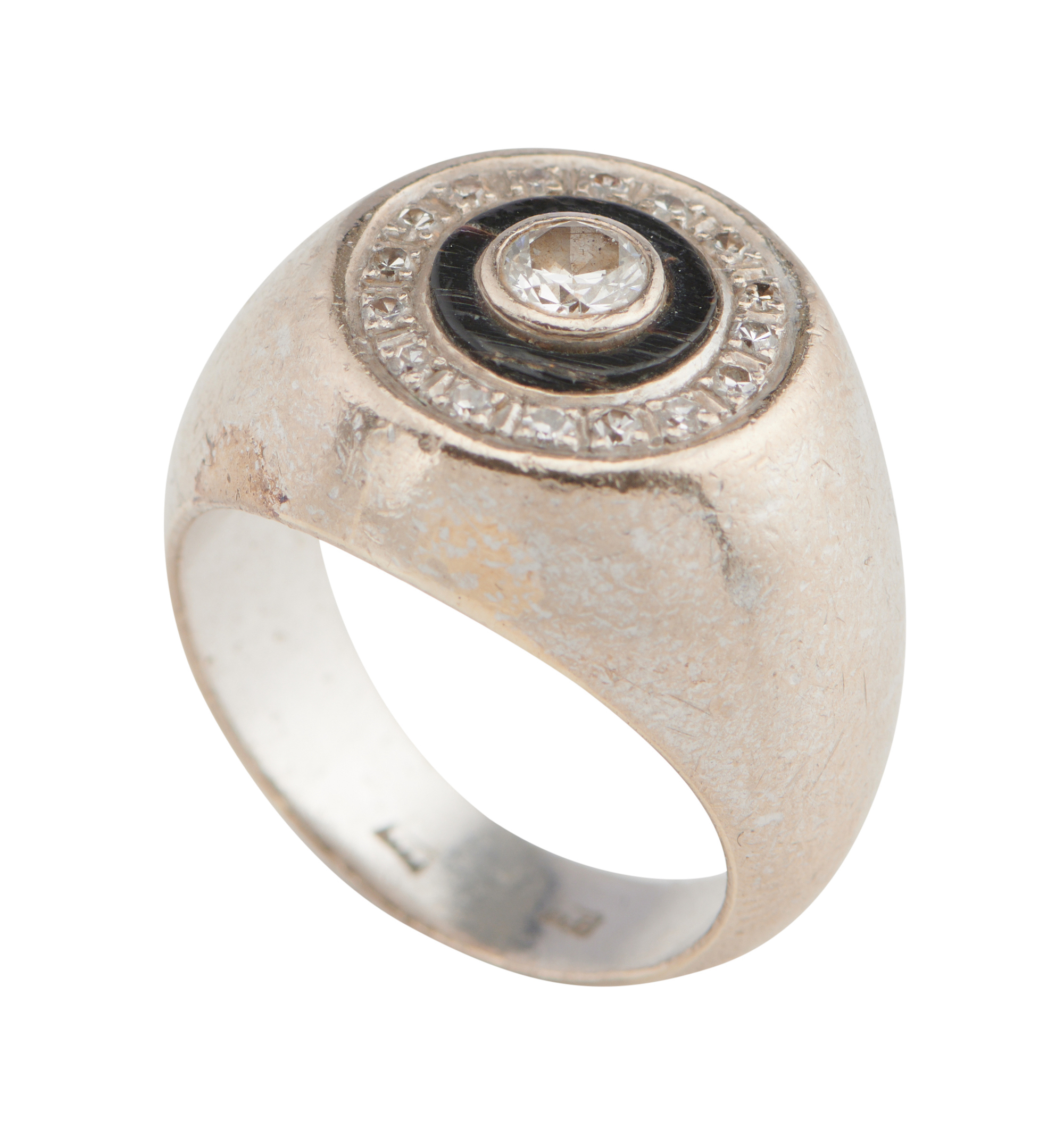 Centring a bezel-set brilliant-cut diamond weighing approximately 0.20 carats within an onyx surround, further set with brilliant-cut diamonds together weighing approximately 0.30 carats, size L.