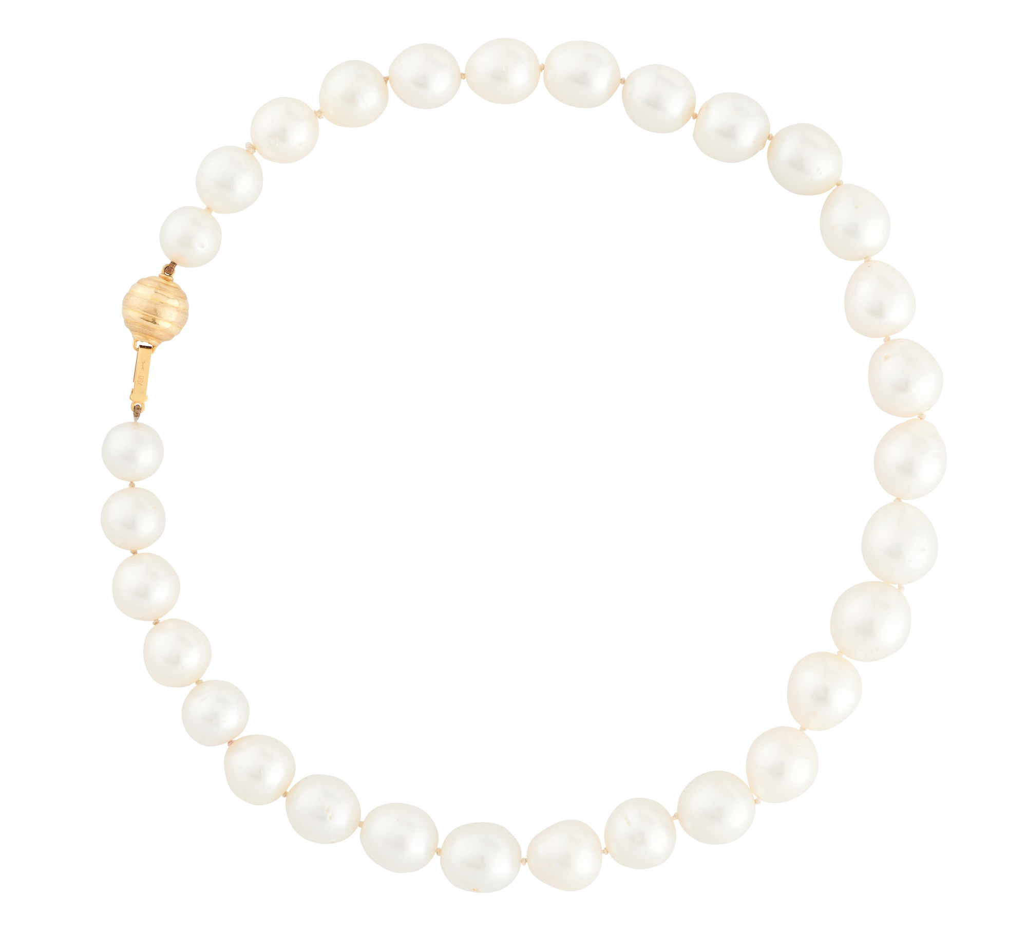 Comprising thirty semi-baroque graduated pearls of silver white hues measuring approximately 10.1mm - 13.0mm, completed by a ball clasp in 18ct gold, length approximately 410mm.