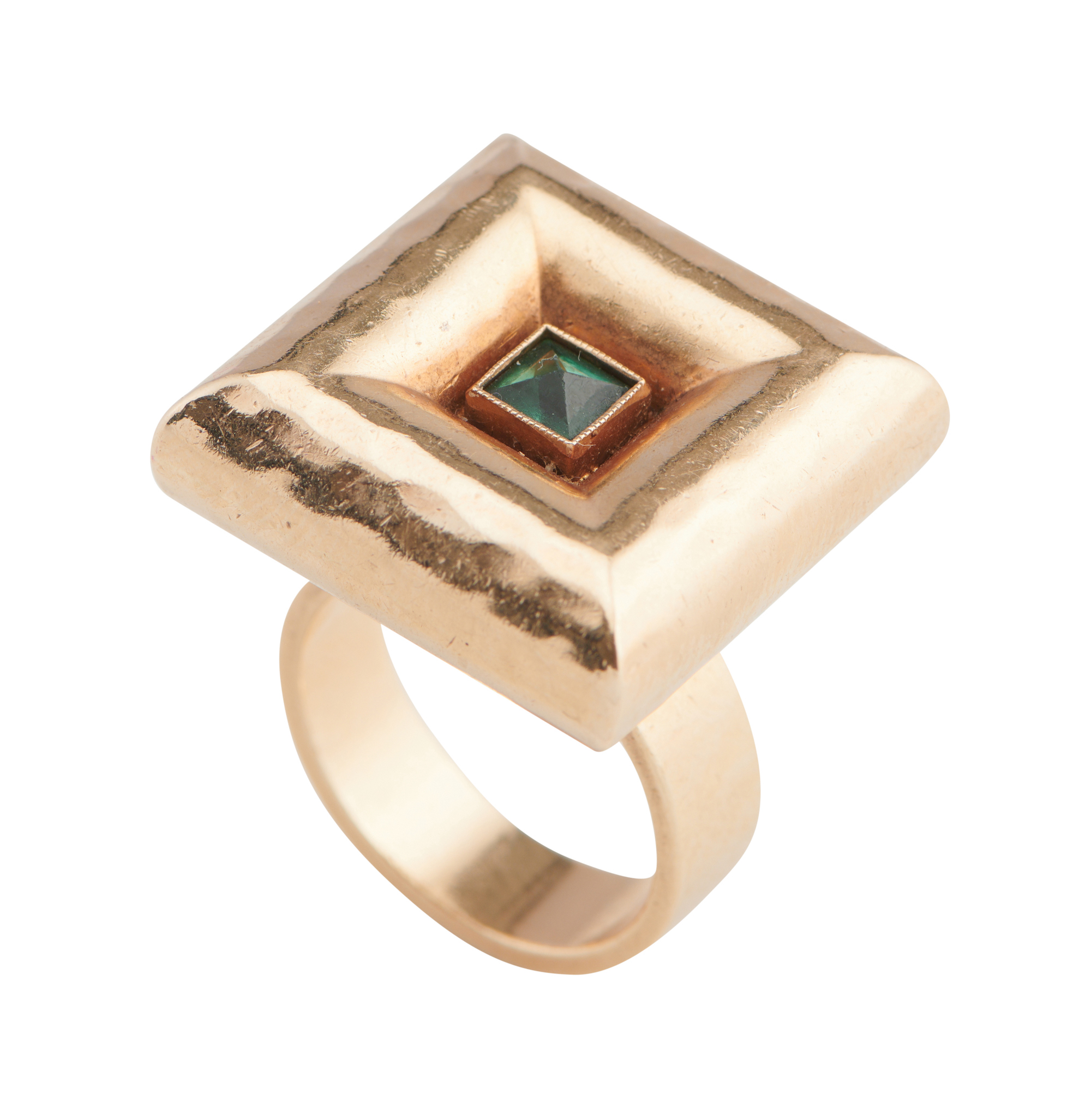 The square plaque, centring a reverse-set square-cut tourmaline, within a curved beaten gold surround, size J 1/2.