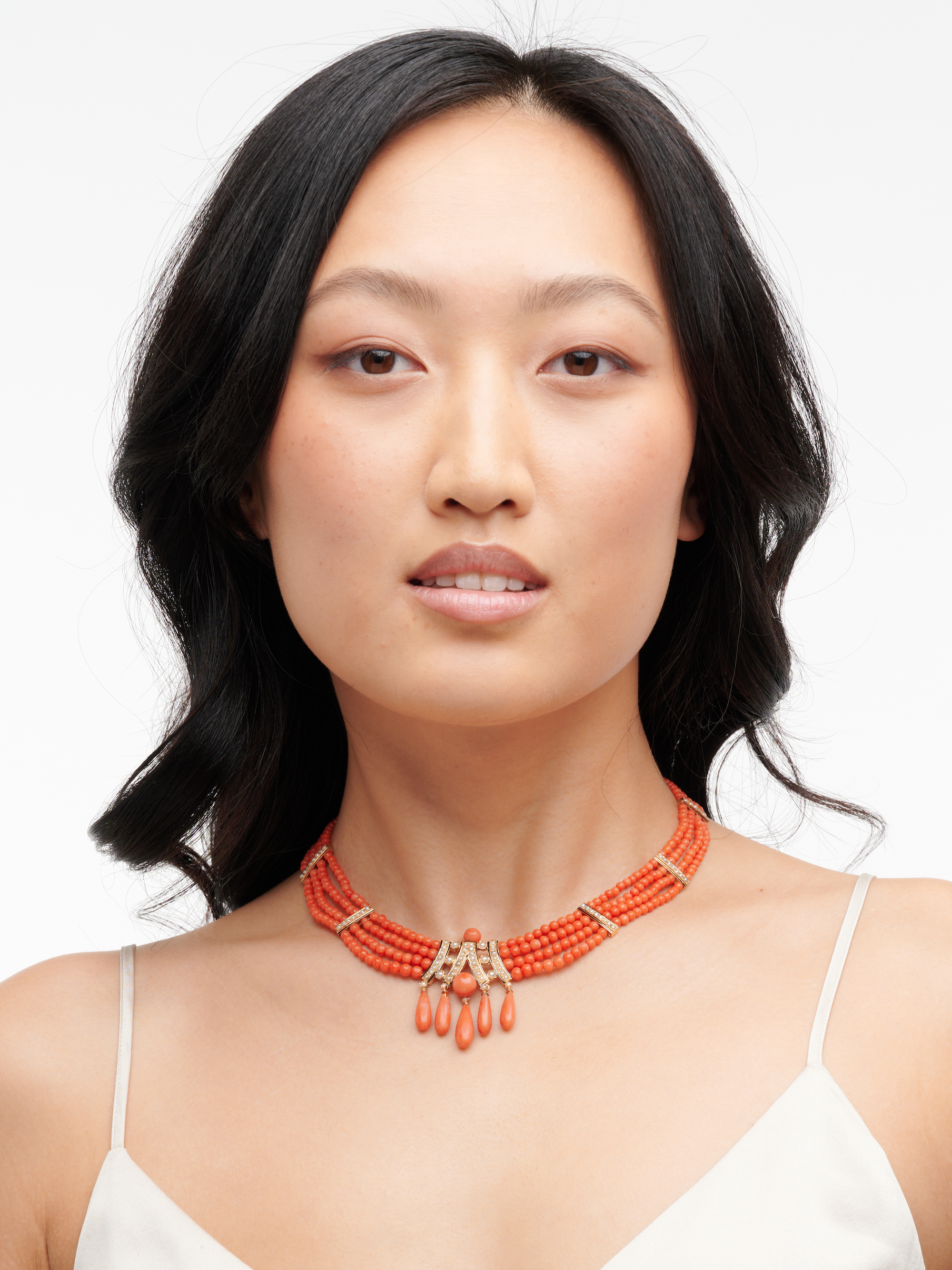 The multistrand coral bead collar, set at intervals with gold, black enamel and seedpearl spacers, centring a similarly set panel suspending tapered coral drops, completed by an enamel and coral set box clasp, French marks, length approximately 410mm, two seedpearls deficient.