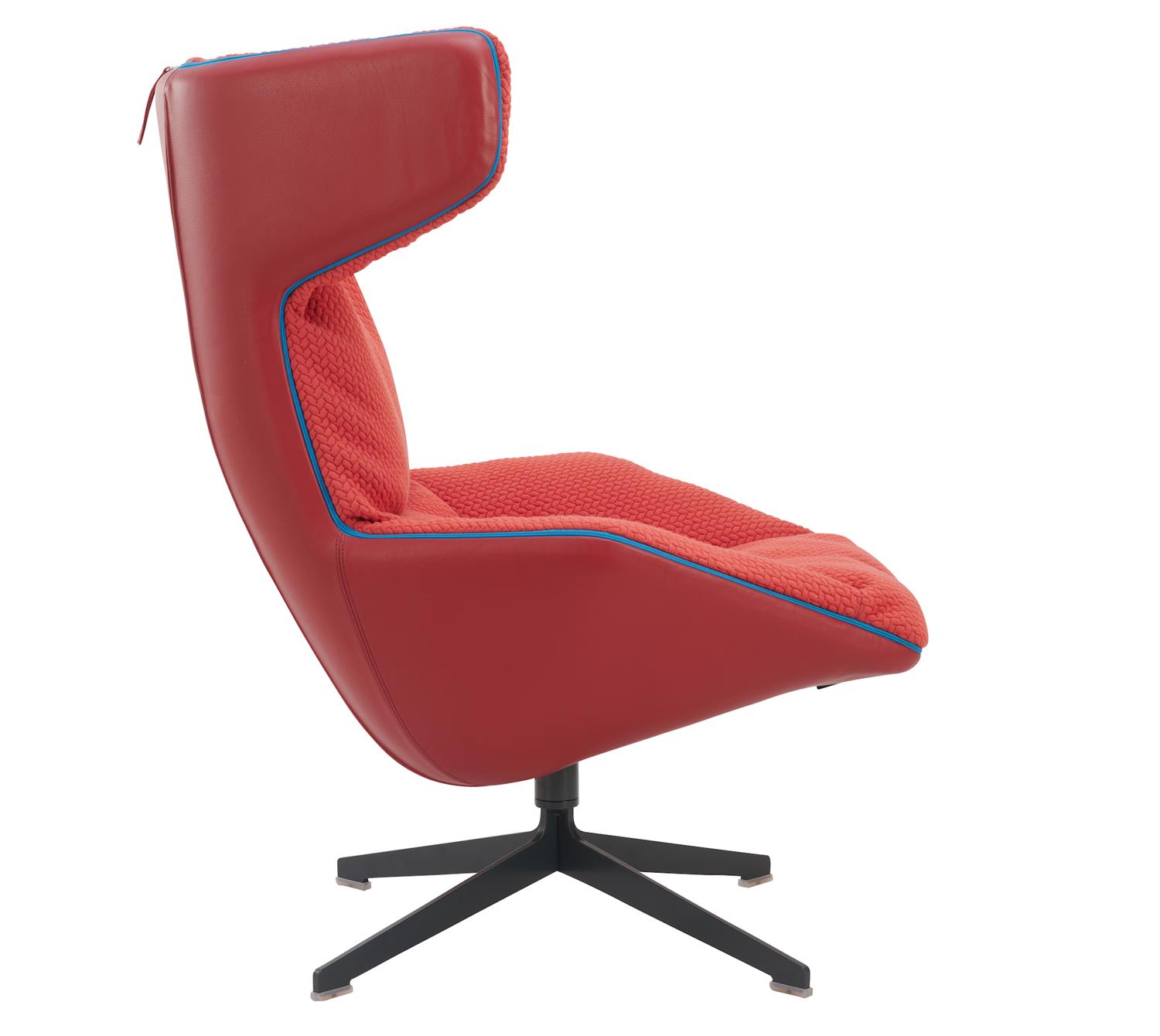 The red leather chair comes with an inner fabric 'quilt' lining which is attached with blue zips. The chair is functional with the cover attached or detached, depending on the style choice. Powder coated steel swivel base.