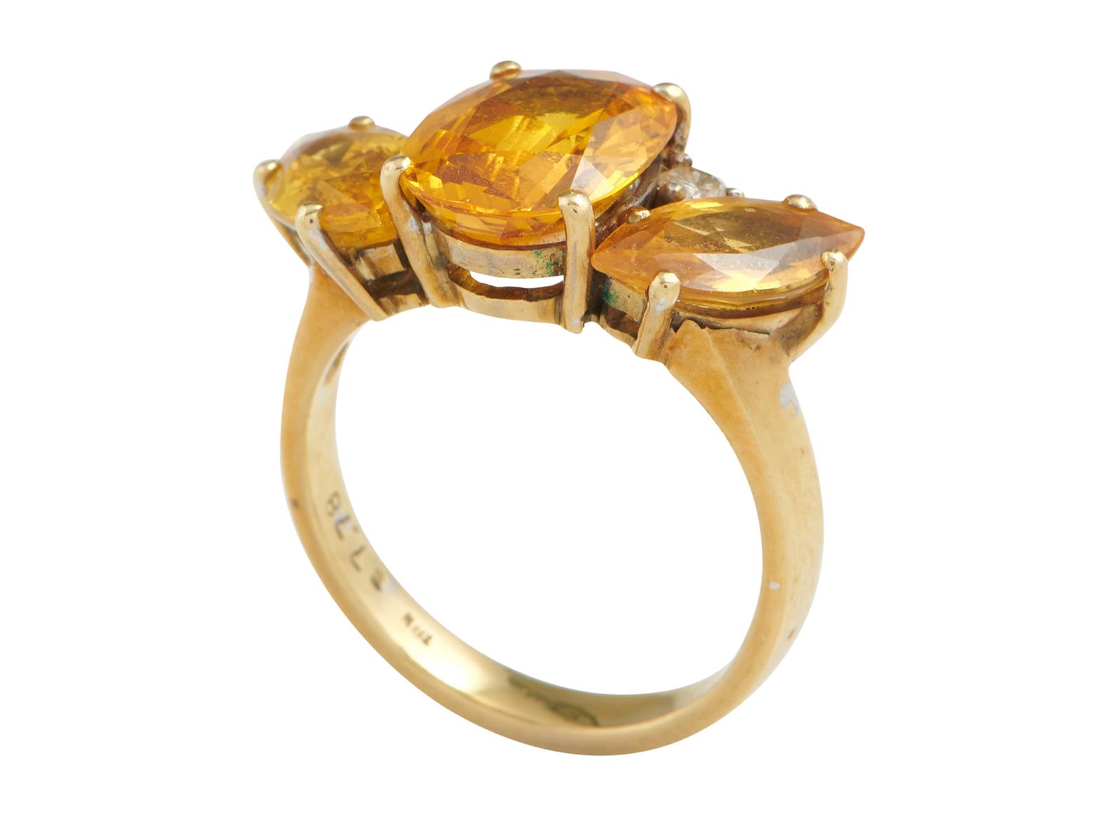 A SAPPHIRE AND DIAMOND RING IN 18CT GOLD, CENTRING A CLAW-SET OVAL-CUT YELLOW SAPPHIRE WEIGHING APPROXIMATELY 4.43 CARATS, FLANKED BY MARQUISE-CUT YELLOW SAPPHIRES TOGETHER WEIGHING APPROXIMATELY 3.35 CARATS, AND BRILLIANT-CUT DIAMONDS TOGETHER WEIGHING APPROXIMATELY 0.15 CARATS, RING SIZE O