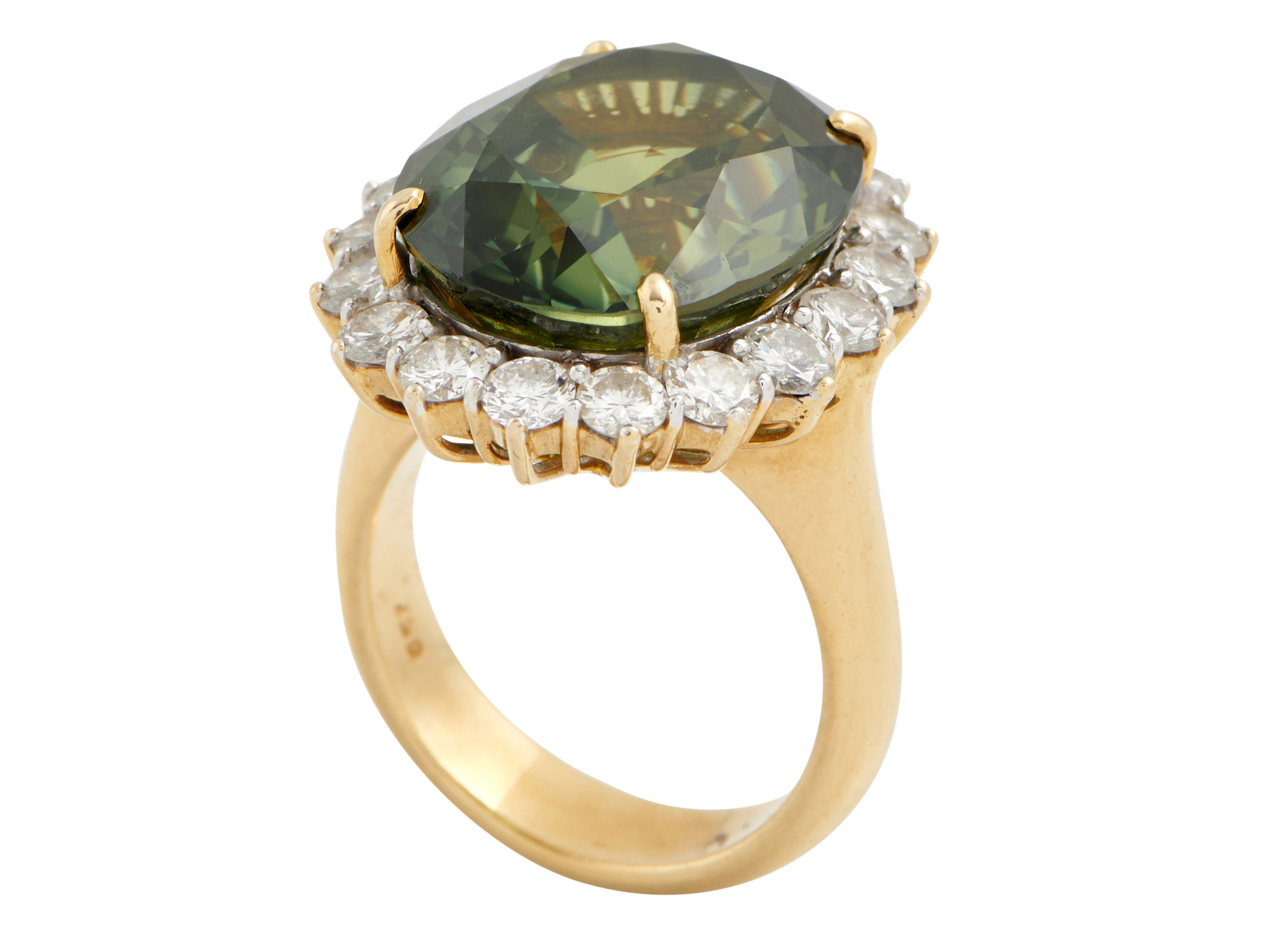 Centring a claw-set oval-cut sapphire weighing approximately 20.05 carats, within a surround of eighteen claw-set brilliant-cut diamonds together weighing approximately 1.95 carats, size M.