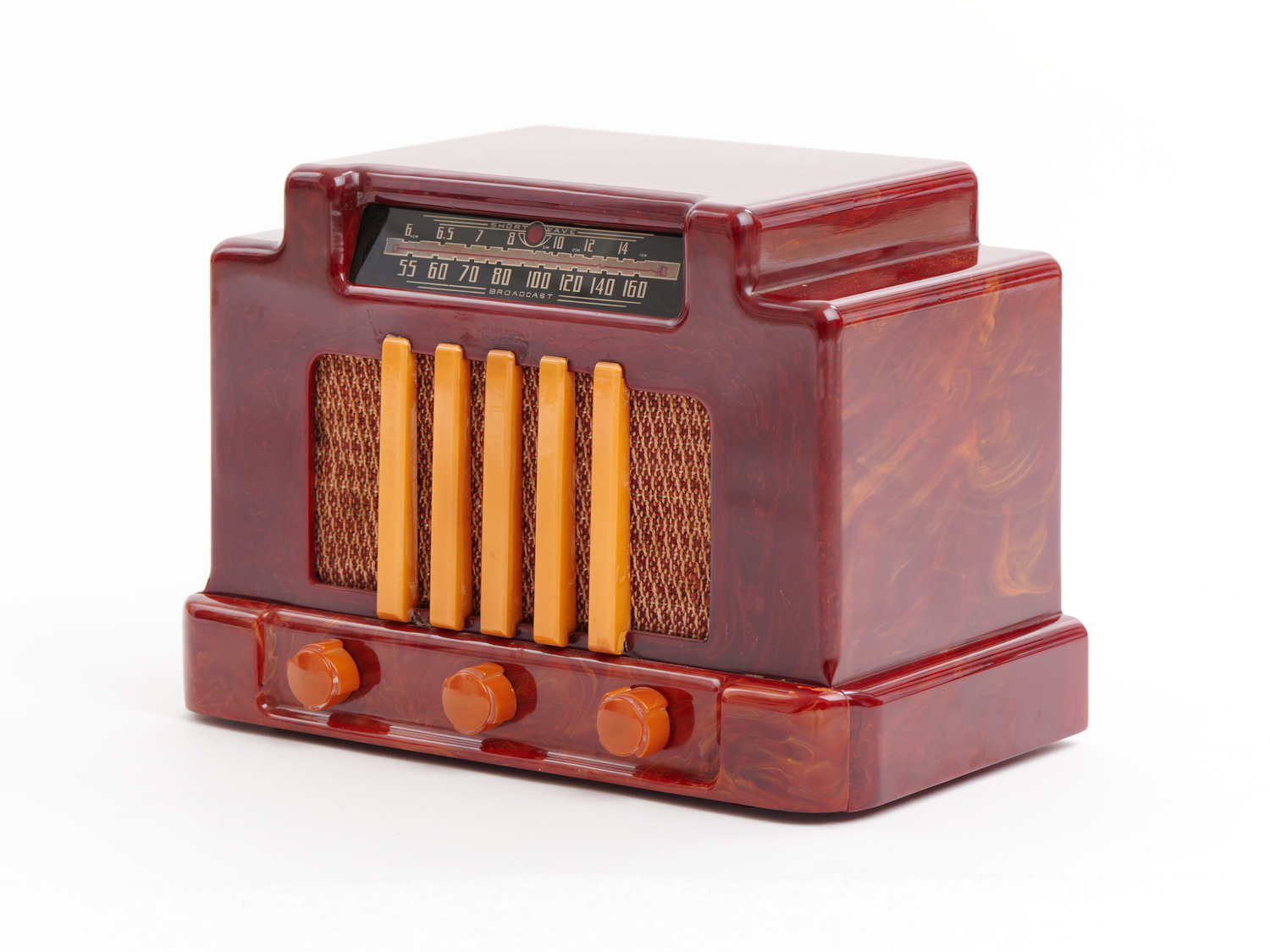 in marbled oxblood and yellow catalin. Manufactured in Canada, c.1940