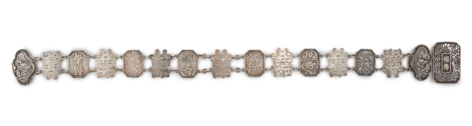 Constructed from linked plaques, including alternating 'shuangxi' characters and octagonal plaques decorated with bamboo, plum, dragons and calligraphy. The buckle stamped 'WH90' for Wang Hing.