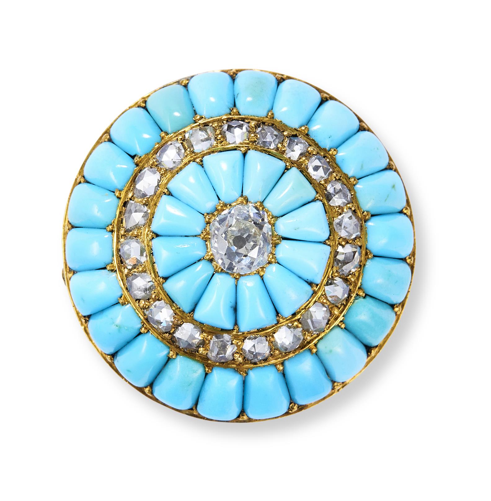 Of target design, claw-set to the centre with an old mine-cut diamond framed by a double row of turquoise between a line of rose-cut diamonds to a fluted half-hoop, the diamonds together weighing approximately 0.60 carats, mounted in 15ct gold, size J.