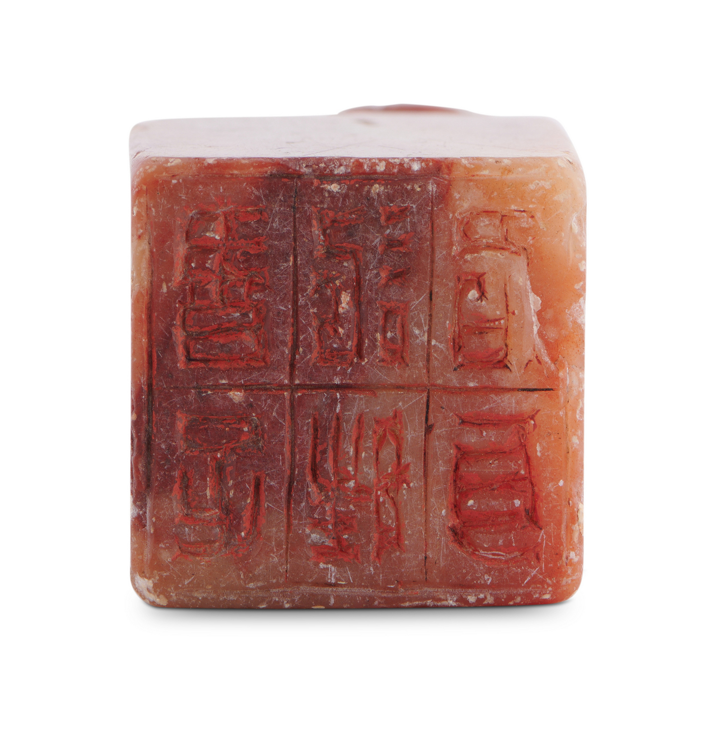Carved with a guardian lion and cup finial, an inscription to one side, and a six character mark in seal script to the base.