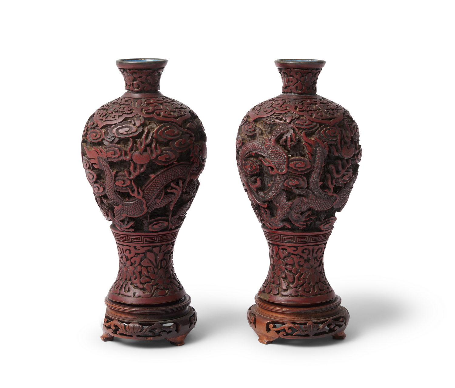 A PAIR OF CHINESE CINNABAR DRAGON VASES
