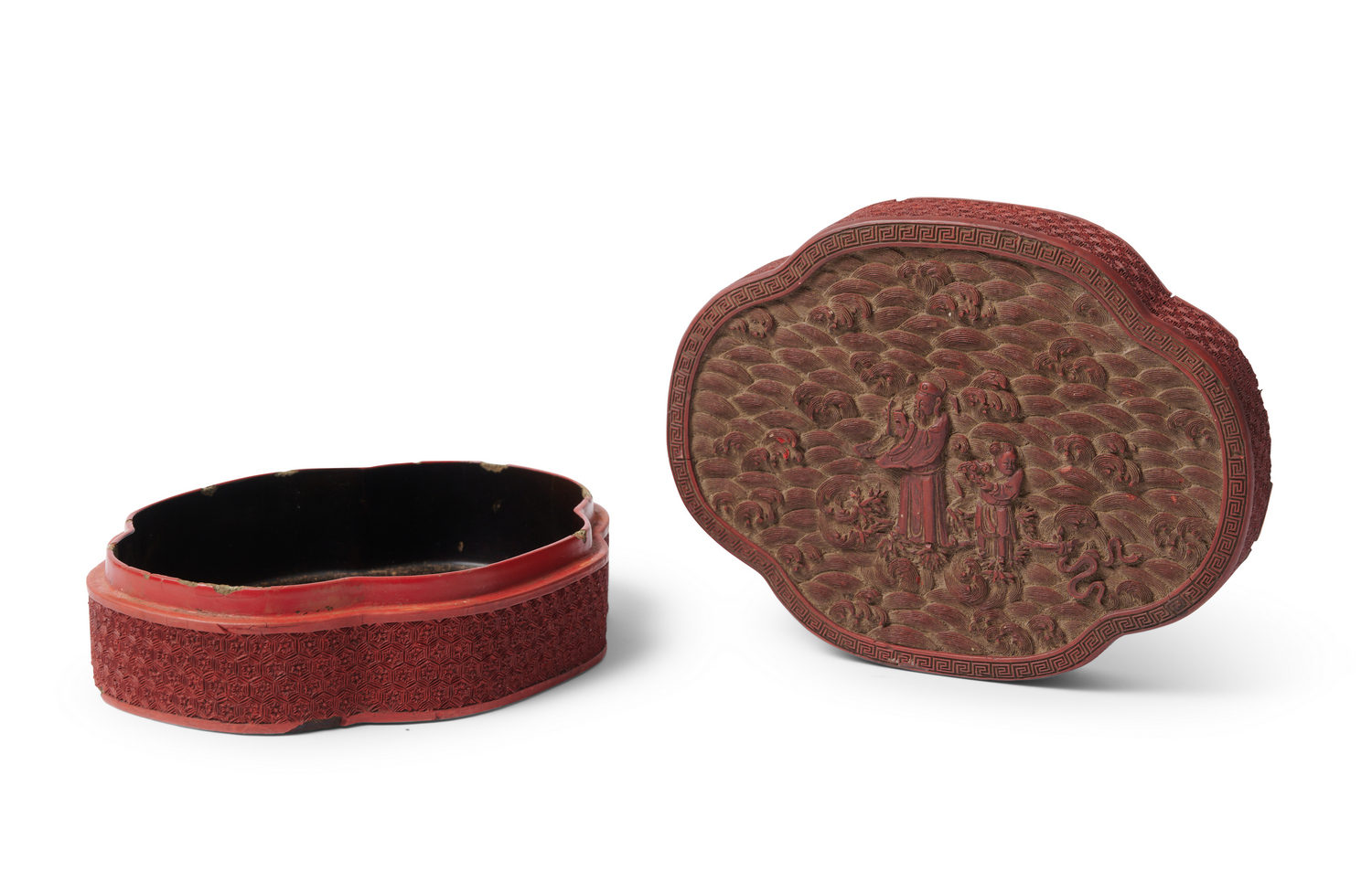Of four-lobed form, decorated with a Taoist figure and boy attendant riding a bamboo bough surrounded by ocean waves, the sides with a hexagonal diaper pattern.