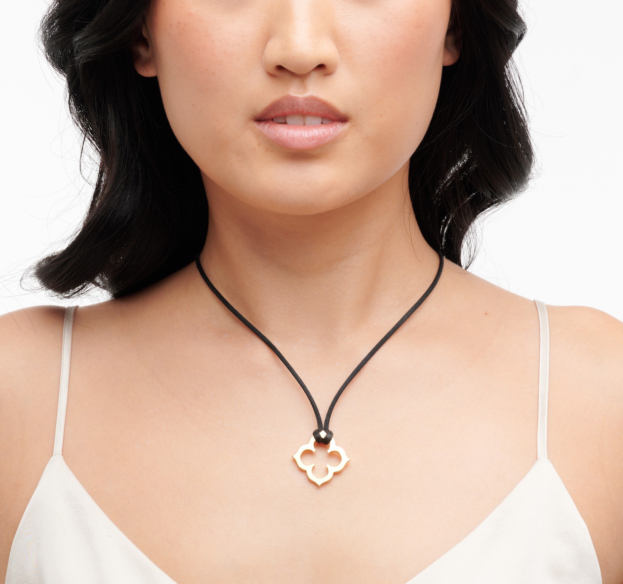 Styled as an open quatrefoil motif, to a black silk cord, signed Cartier and numbered BZ1205, length approximately 255mm.