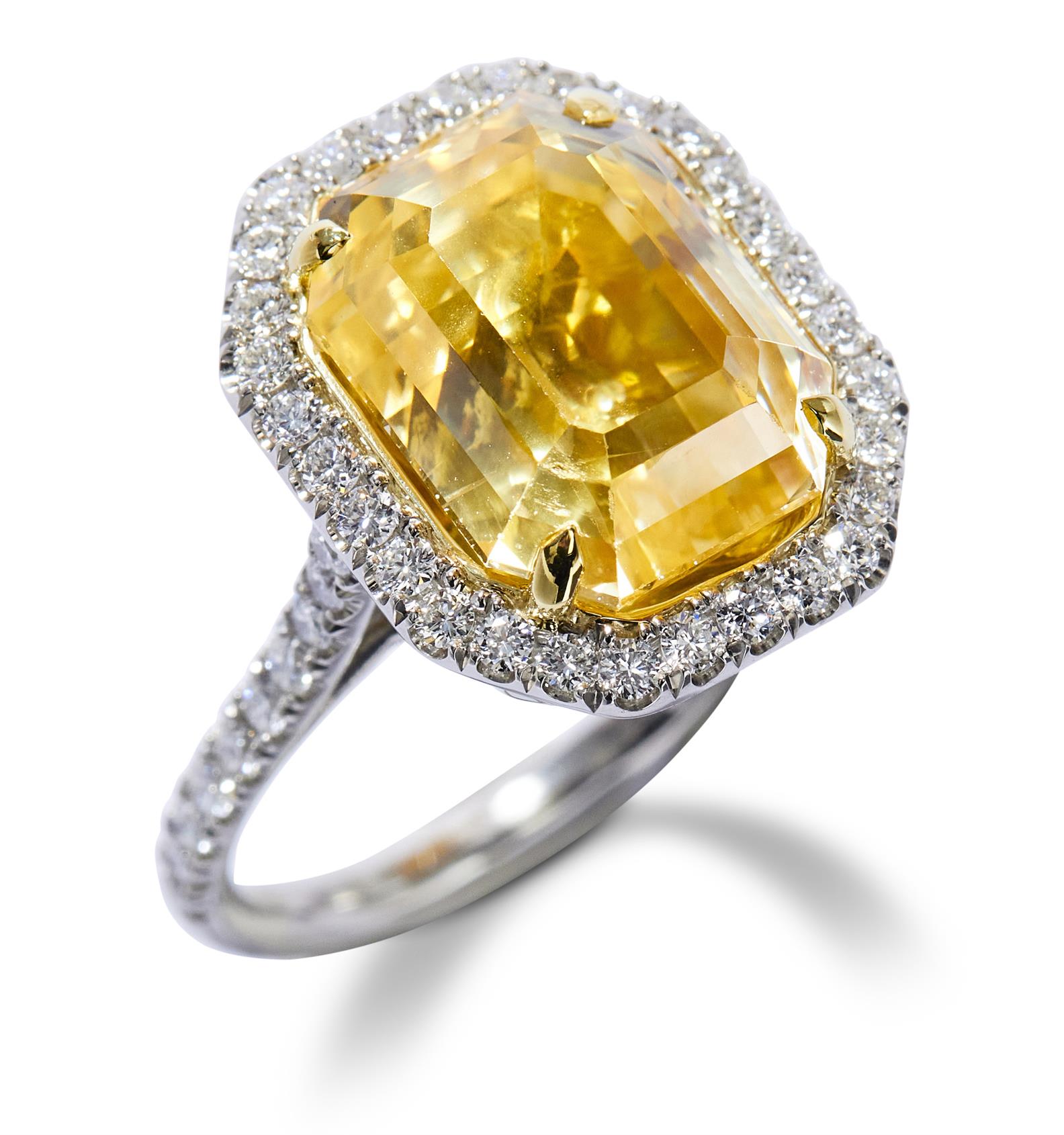 Of cluster design, centring a claw-set octagonal-shaped yellow sapphire weighing 13.73 carats, framed by a halo of pavé-set brilliant-cut diamonds to similarly set shoulders, the 50 small diamonds together weighing approximately 0.81 carats, mounted in platinum and 18ct gold, size M1/2.