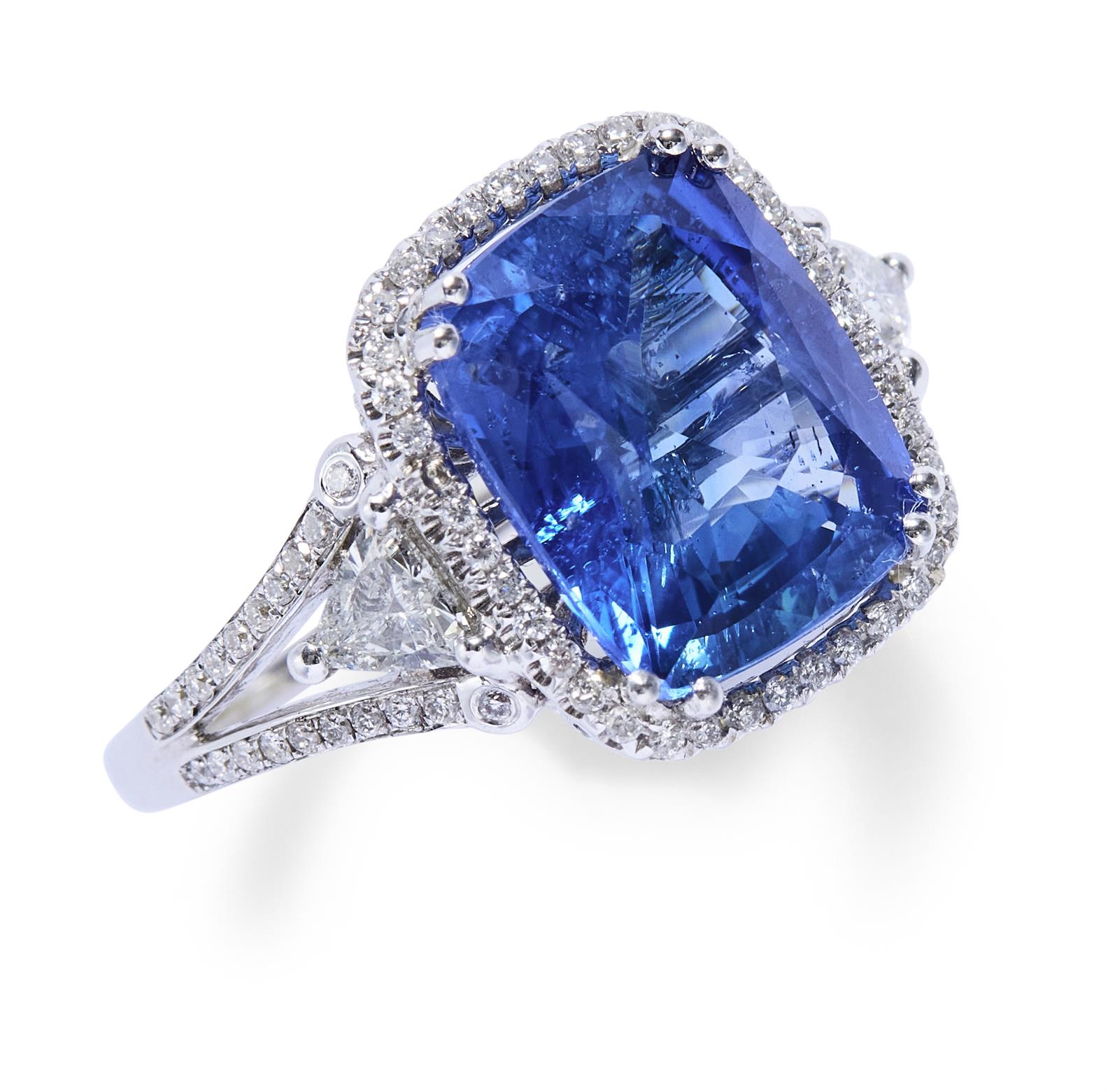 Of cluster design, centring a claw-set cushion-shaped sapphire weighing 7.02 carats, framed by a halo of brilliant-cut diamonds flanked by a trilliant-cut diamond between split shoulders pavé-set with brilliant-cut diamonds, the diamonds together weighing approximately 0.76 carats, mounted in 18ct white gold, size M1/2.