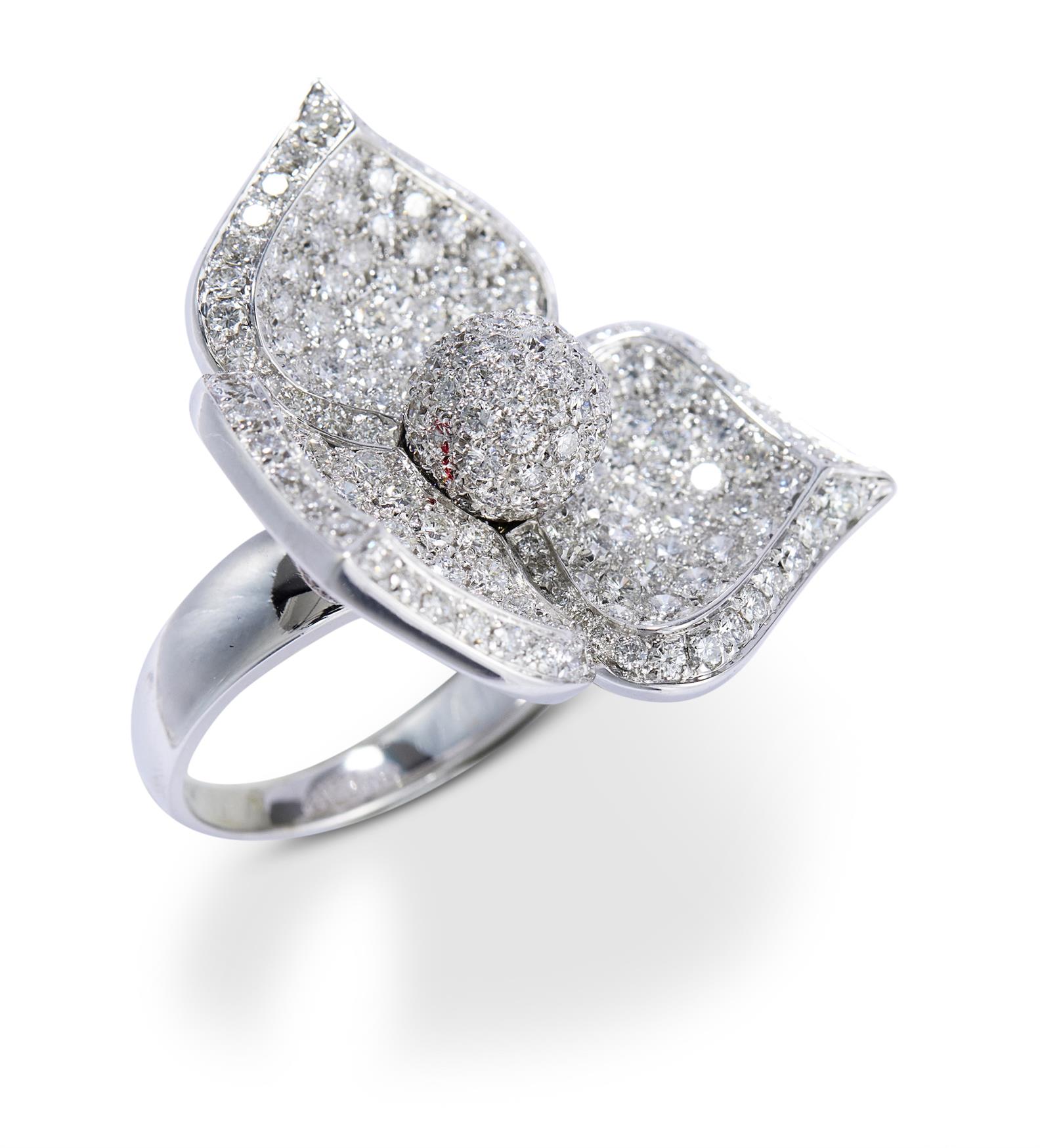 Modelled as a flowerhead, pavé-set with brilliant-cut diamonds, the diamonds together weighing approximately 9.00 carats, mounted in 18ct white gold, size Q.